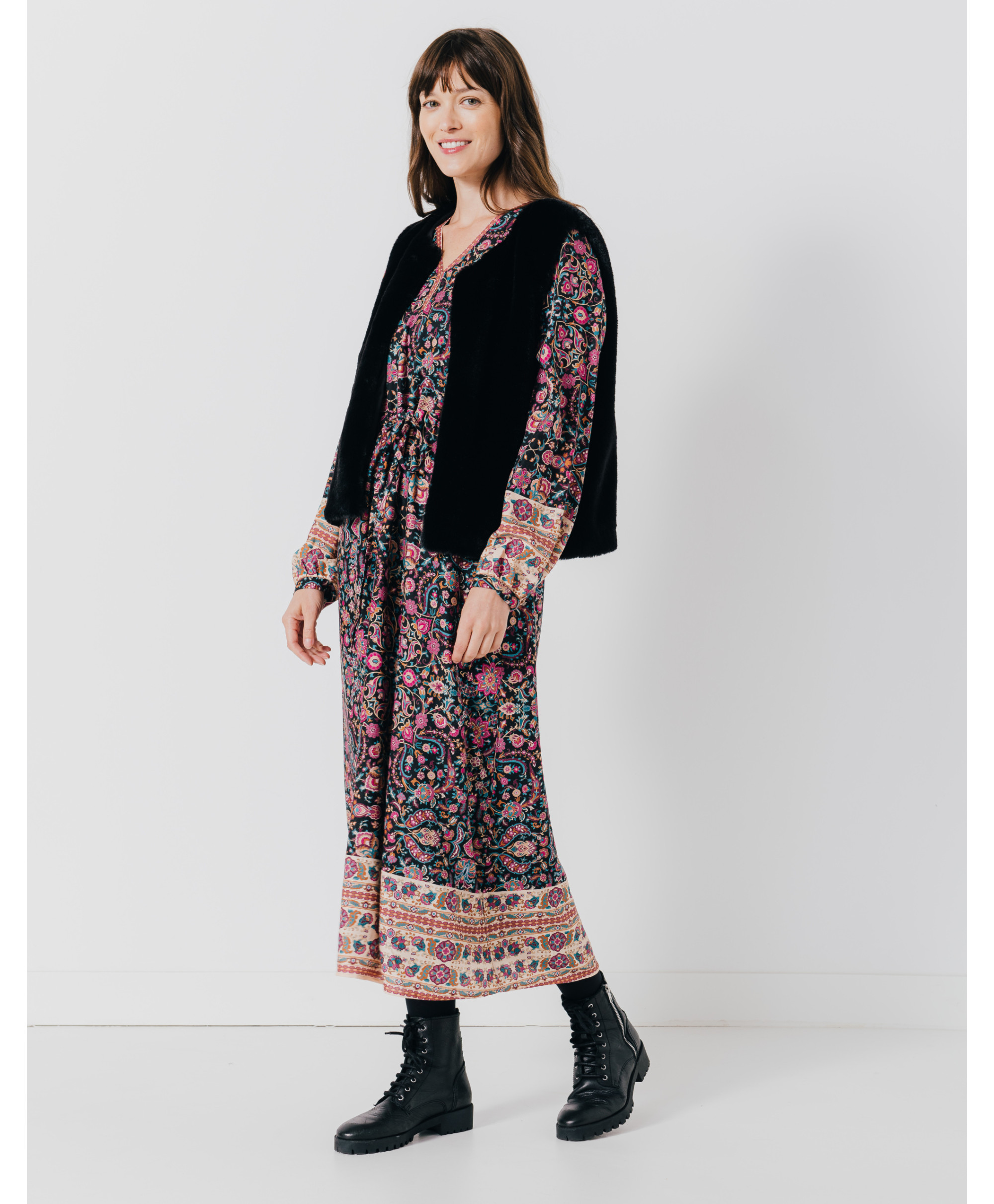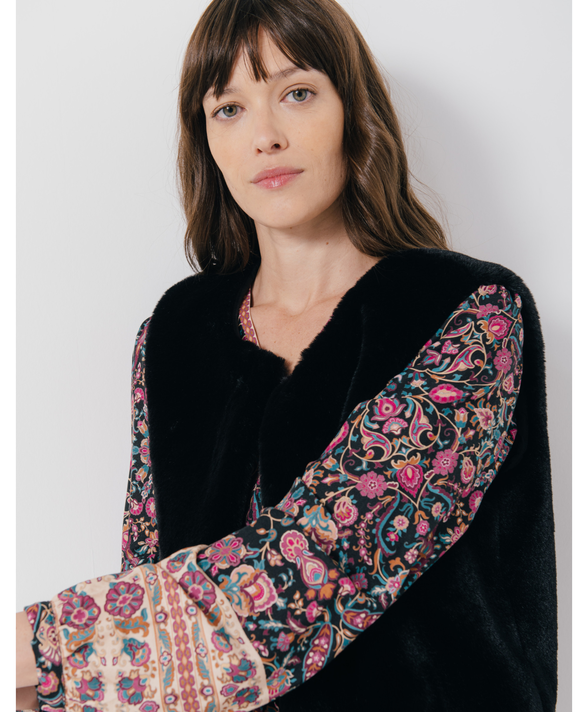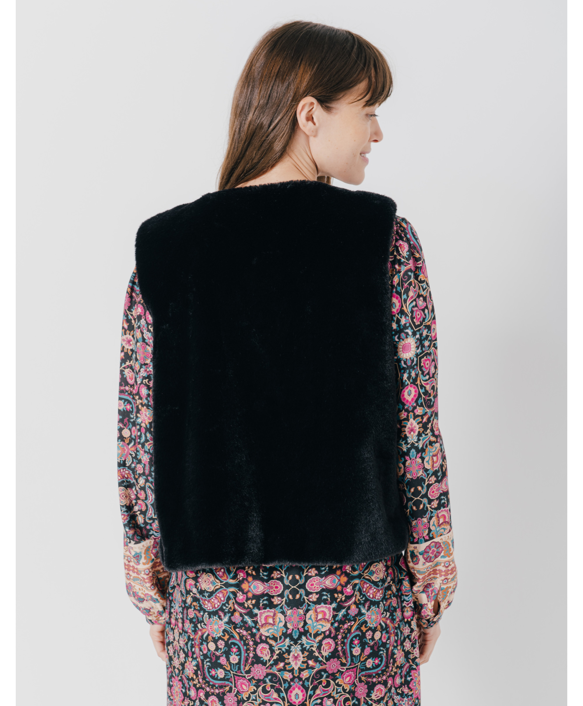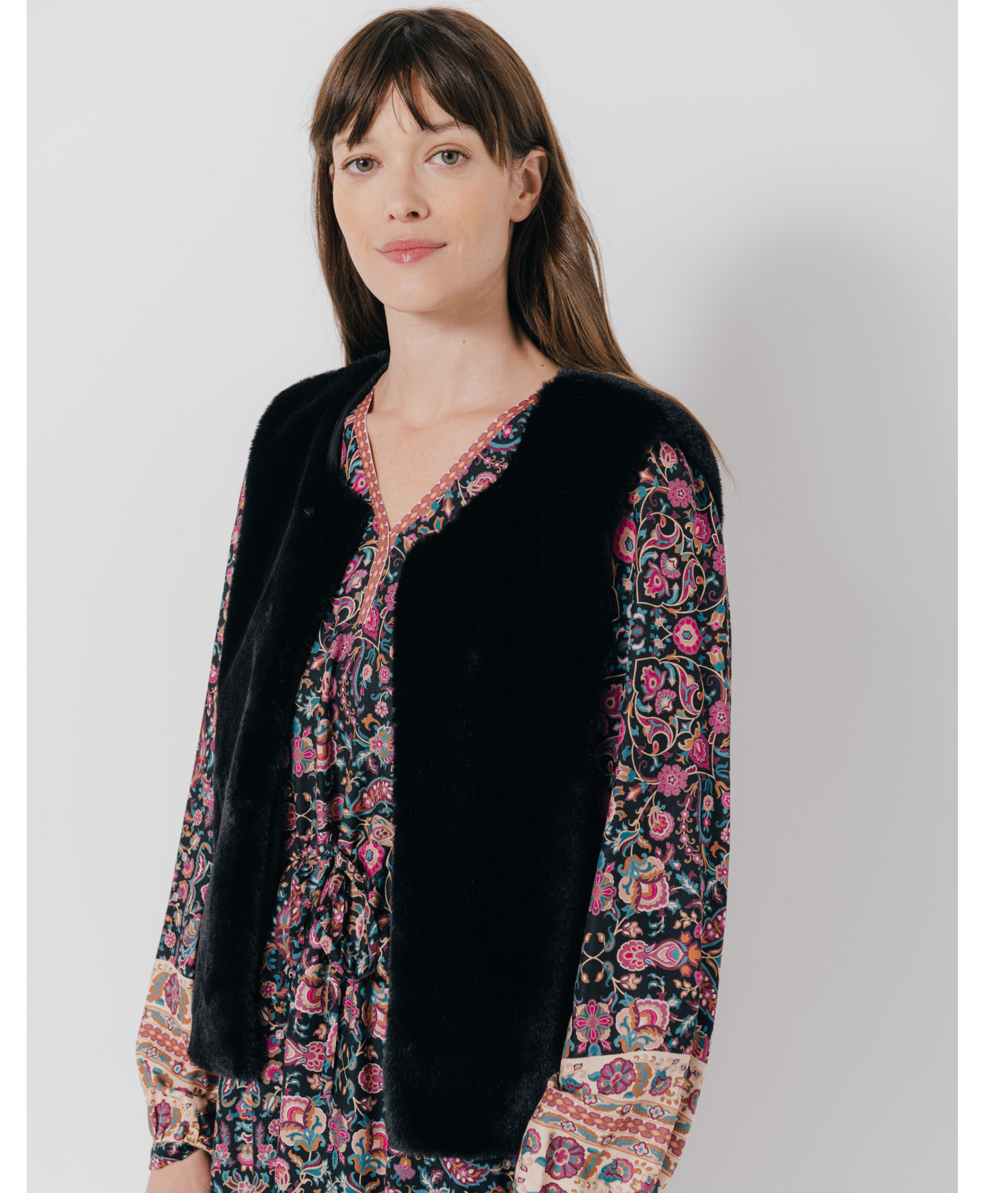 Avec cette superbe veste sans manches JAVA, vous aurez hâte de le porter dès le début de saison ! On l'aime pour sa matière fausse fourrure. On la porte avec un pantalon flare et une blouse imprimée. Elle sera votre meilleure alliée dès les premiers froids !