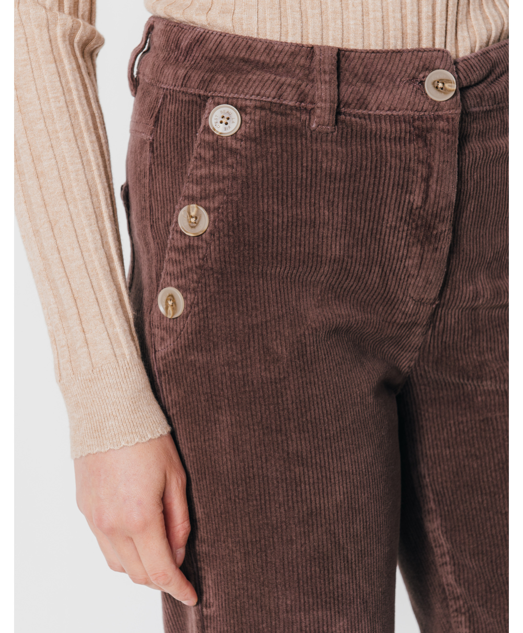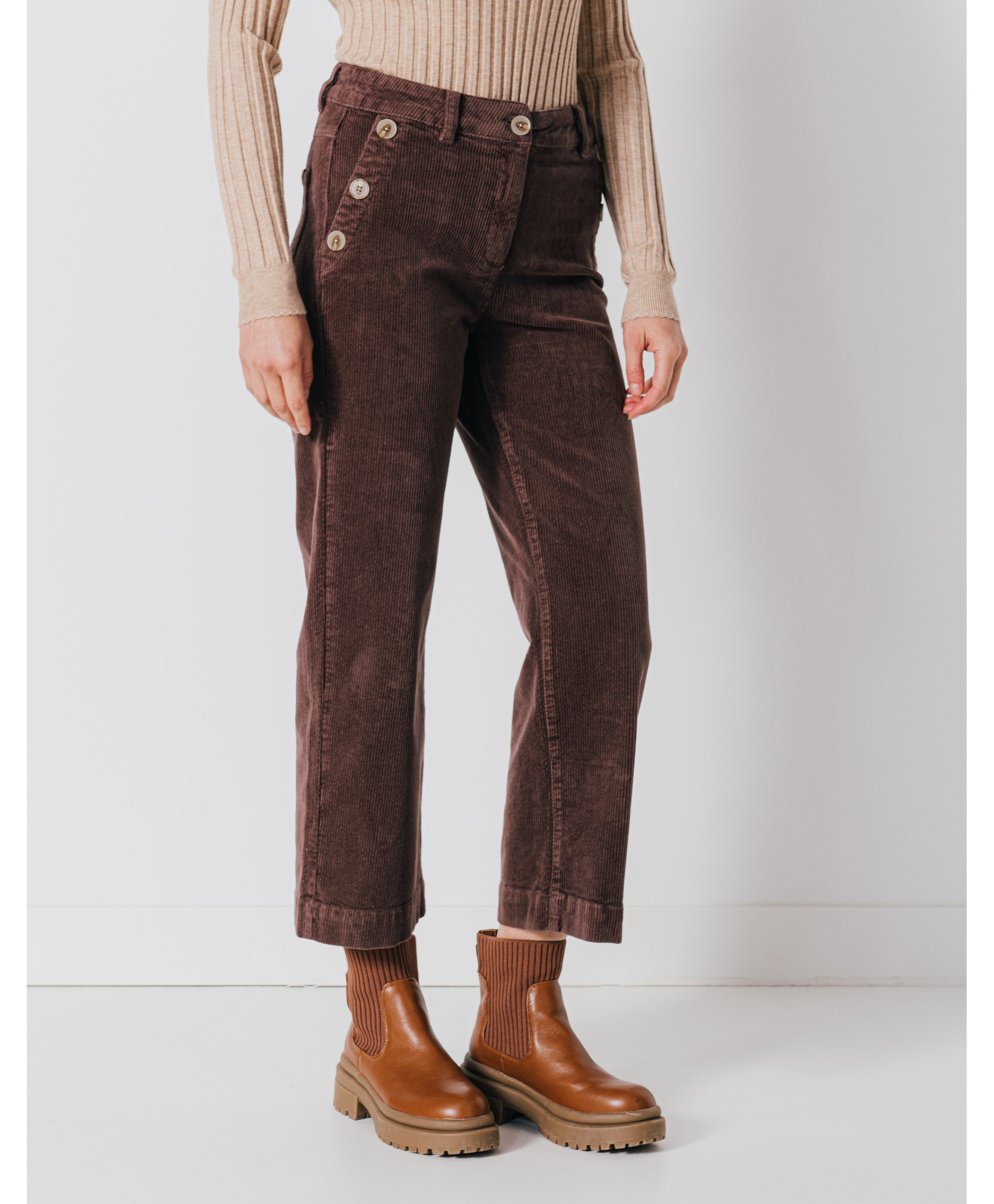Un pantalon en velours coupe flare qui assume pleinement son allure vintage mais si moderne. Avec sa coupe large et ses boutons cornes aux poches pour le style, vous serez au top de la mode. A associer avec un pull en maille fantaisie.