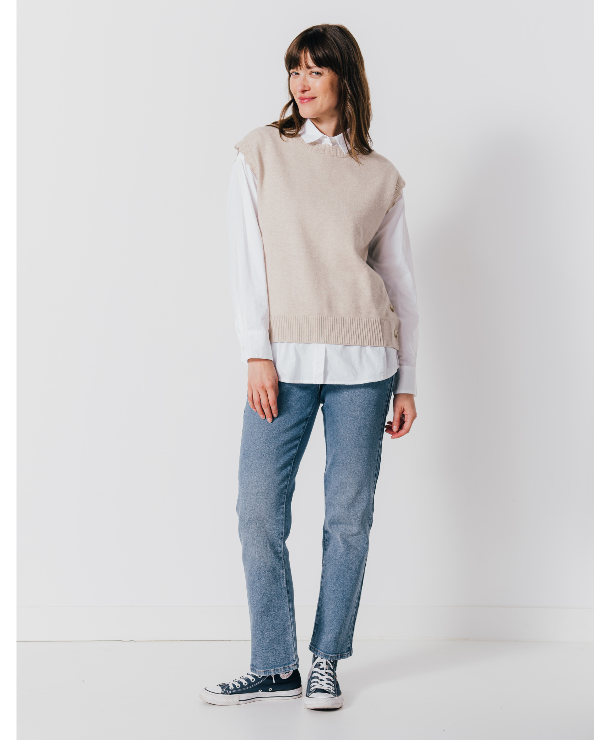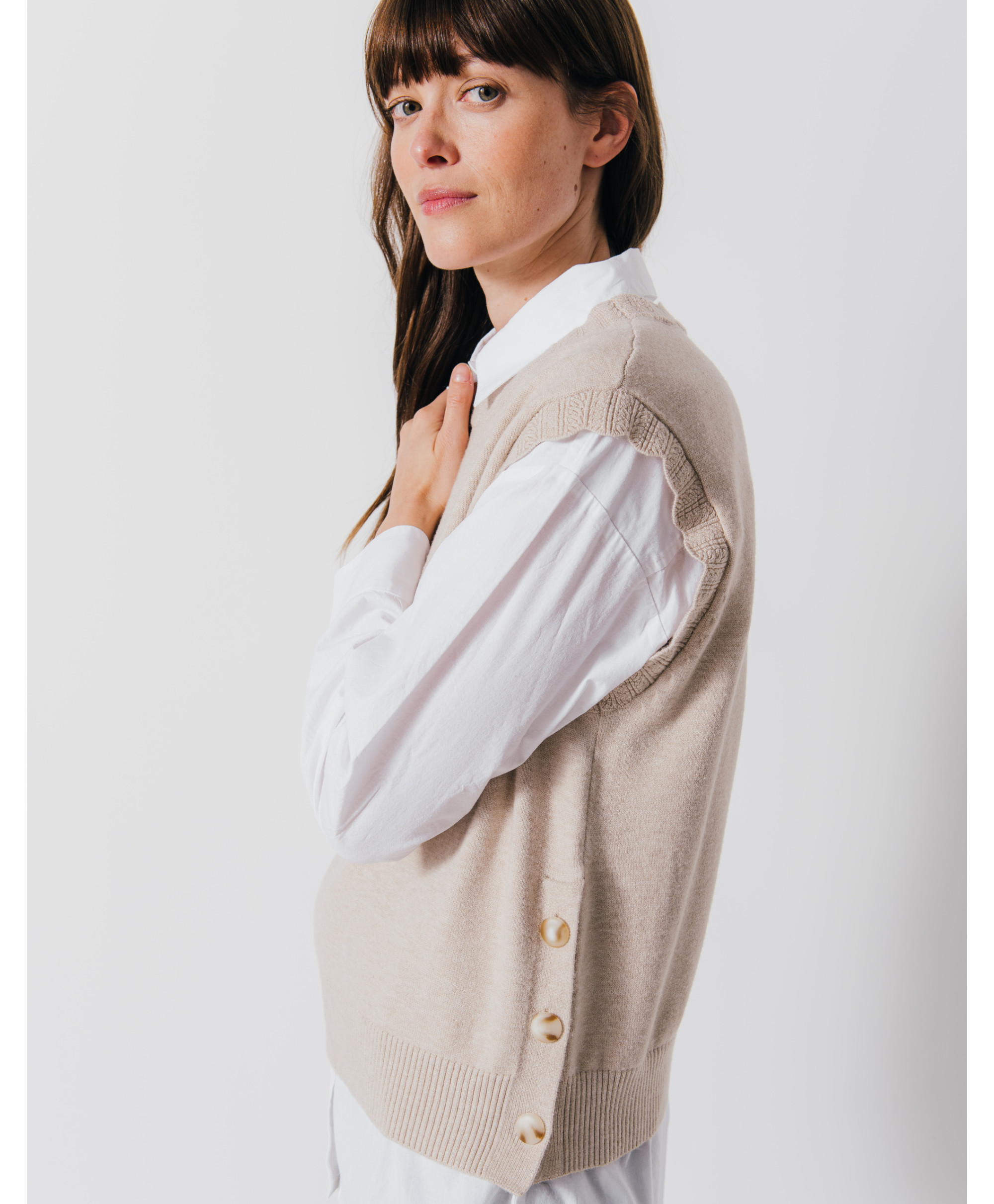Totalement fan de notre pull DENVER ! Offrez à votre tenue un côté de rétro avec sa coupe sans manches, féminisée par ses boutons corne sur les cotés. A mixer à une chemise manche longue blanche, un jean large et des sneakers pour un look branché.