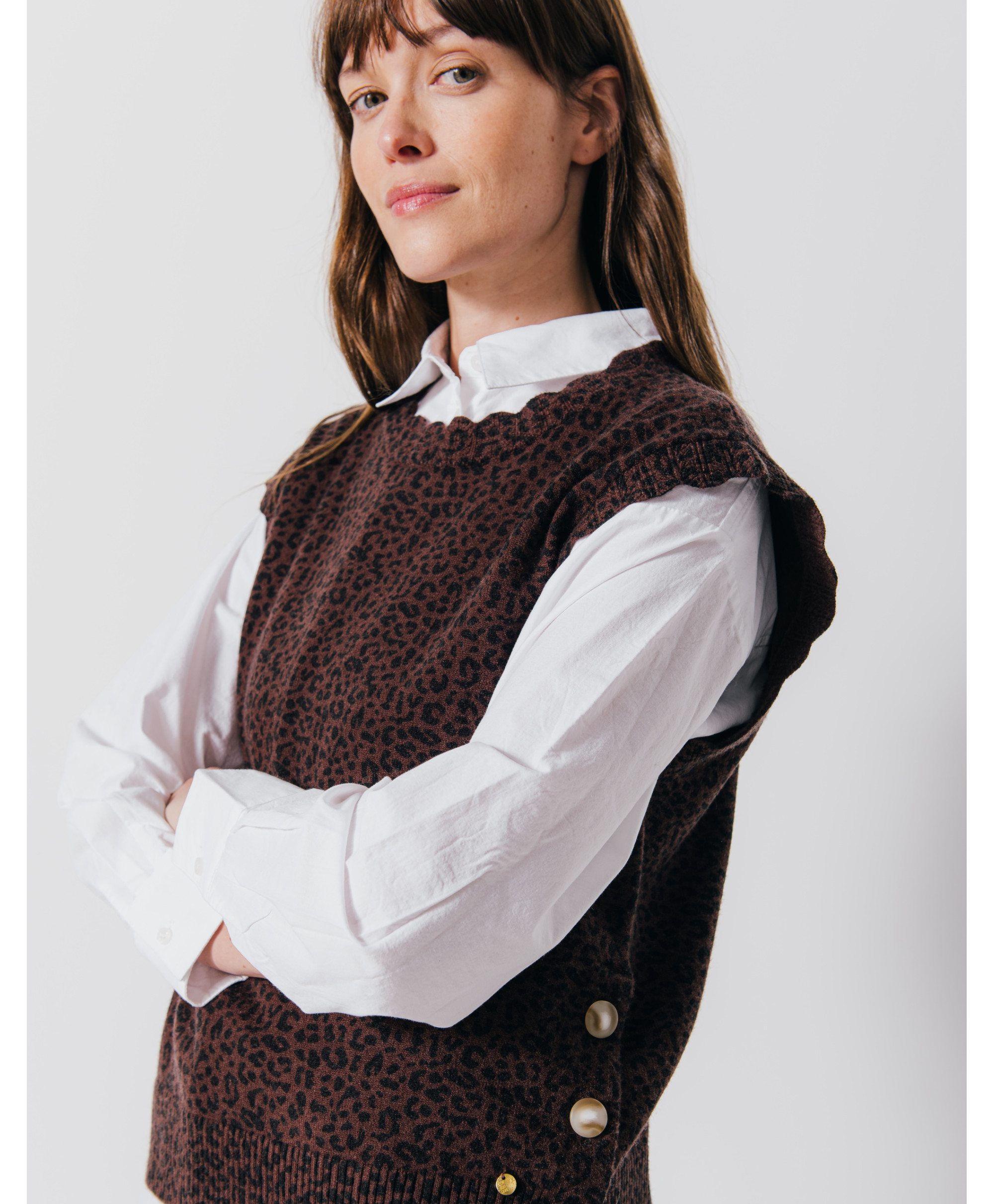 Totalement fan de notre pull DENVER ! Offrez à votre tenue un côté de rétro avec sa coupe sans manches, féminisée par ses boutons corne sur les cotés et son imprimé peau de bête. A mixer à une chemise manche longue blanche, un jean large et des sneakers pour un look branché.