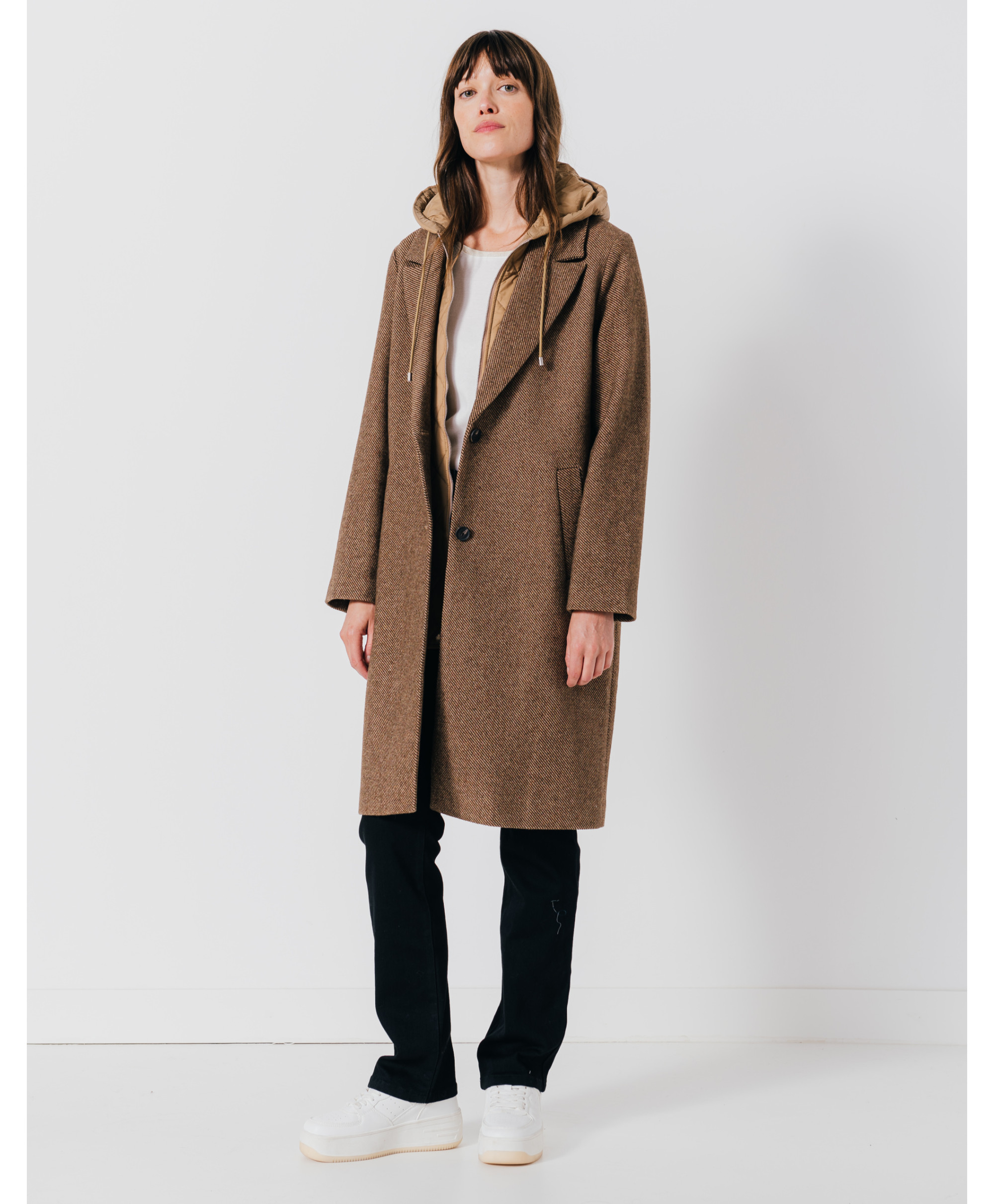 On adore notre manteau long GALAX. Cette pièce tendance dans le style manteau droit est confortable et moderne avec sa capuche intégrée !