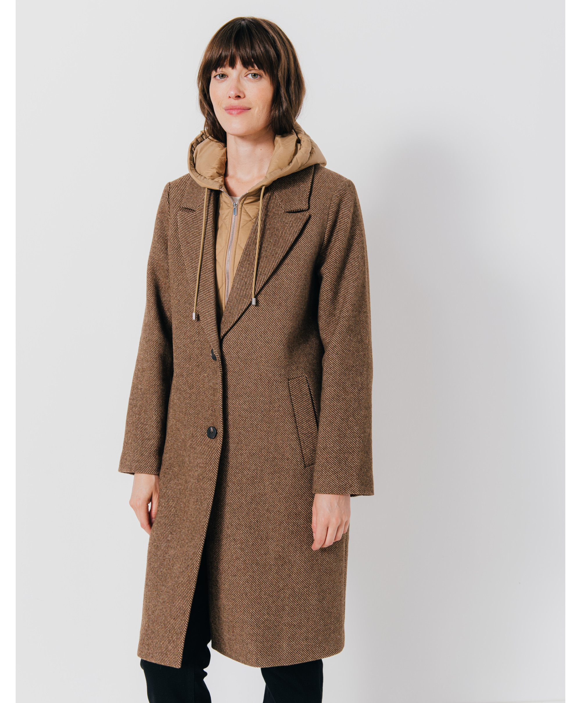 • Col à revers et capuche intégrée