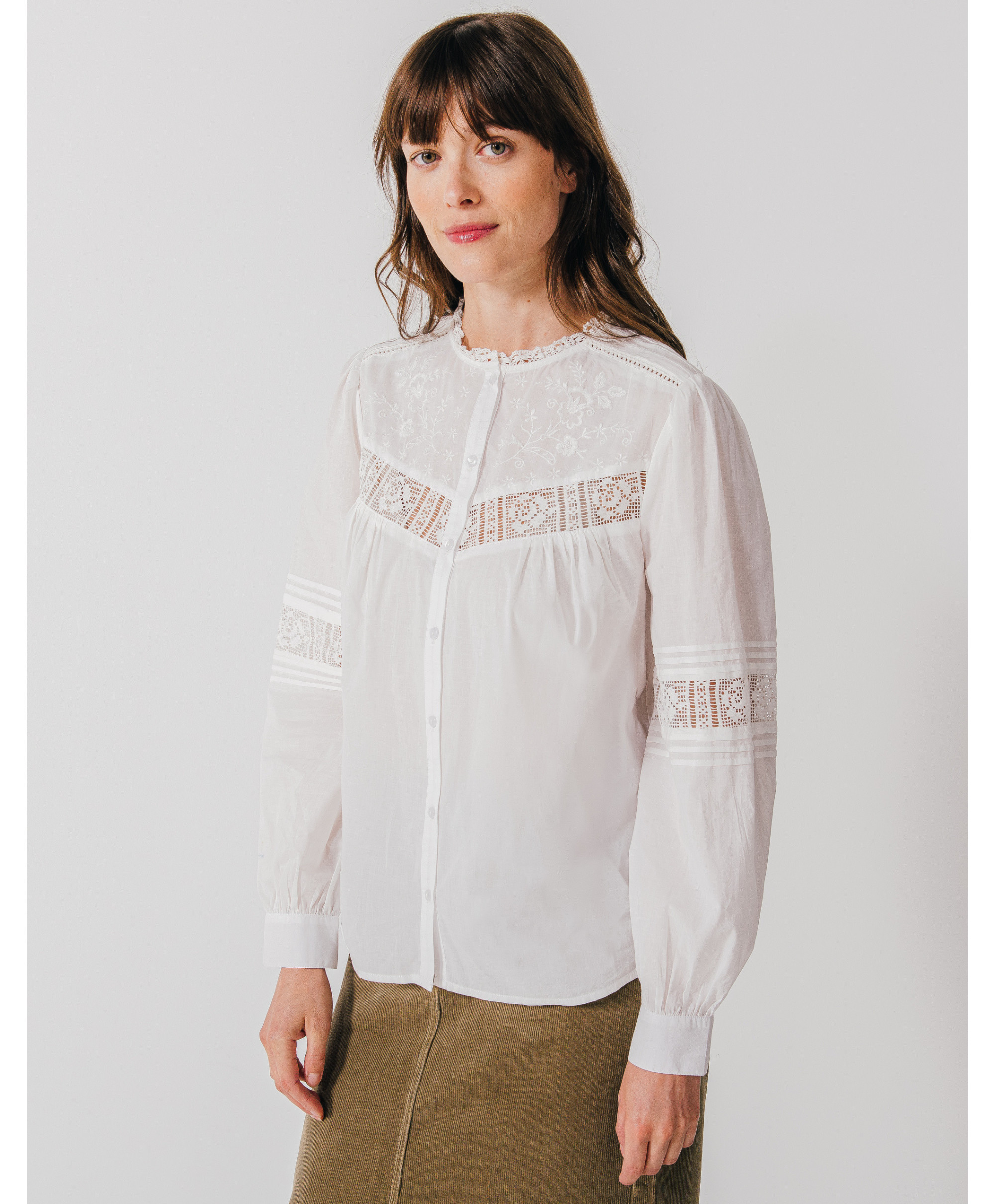 Craquez pour notre chemise féminine ADELE. On l'aime pour tous ses détails hyper féminins : son boutonnage nacré, ses détails de broderies et jeu d'ajourés.