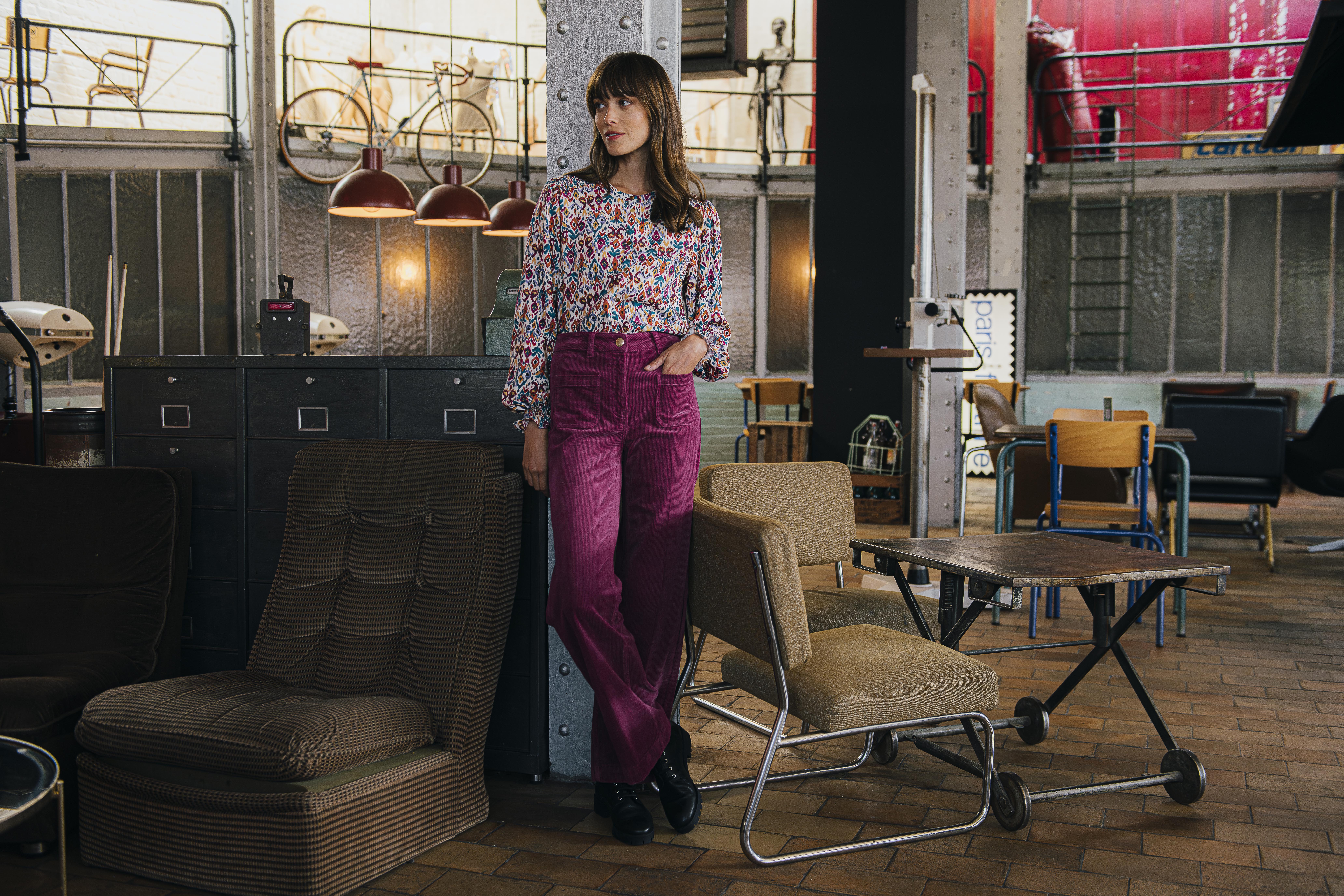 Le mélange de matières riches comme la peau, le denim brut et le velours côtelé crée une allure à la fois brute et raffinée. Les formes, vaporeuses et fluides, évoquent une légèreté bohème, tandis que les imprimés folk apportent un souffle romantique a la silhouette.