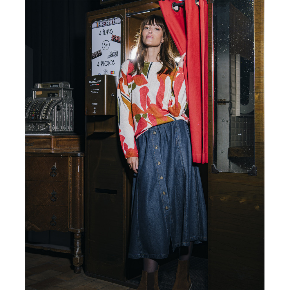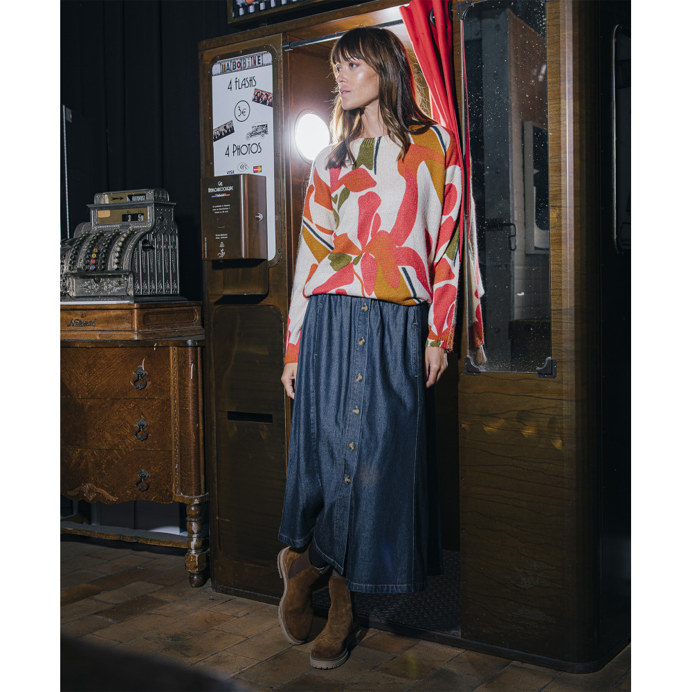 Laissez vous séduire par la forme confortable et incontournable de notre jupe longue en denim ALIZEE. Elastiquée à la taille, cette forme ample vous promet beaucoup d'aisance et souligne votre féminité. Complétez cette jupe avec un pull en maille ajourée pour un look pep's.