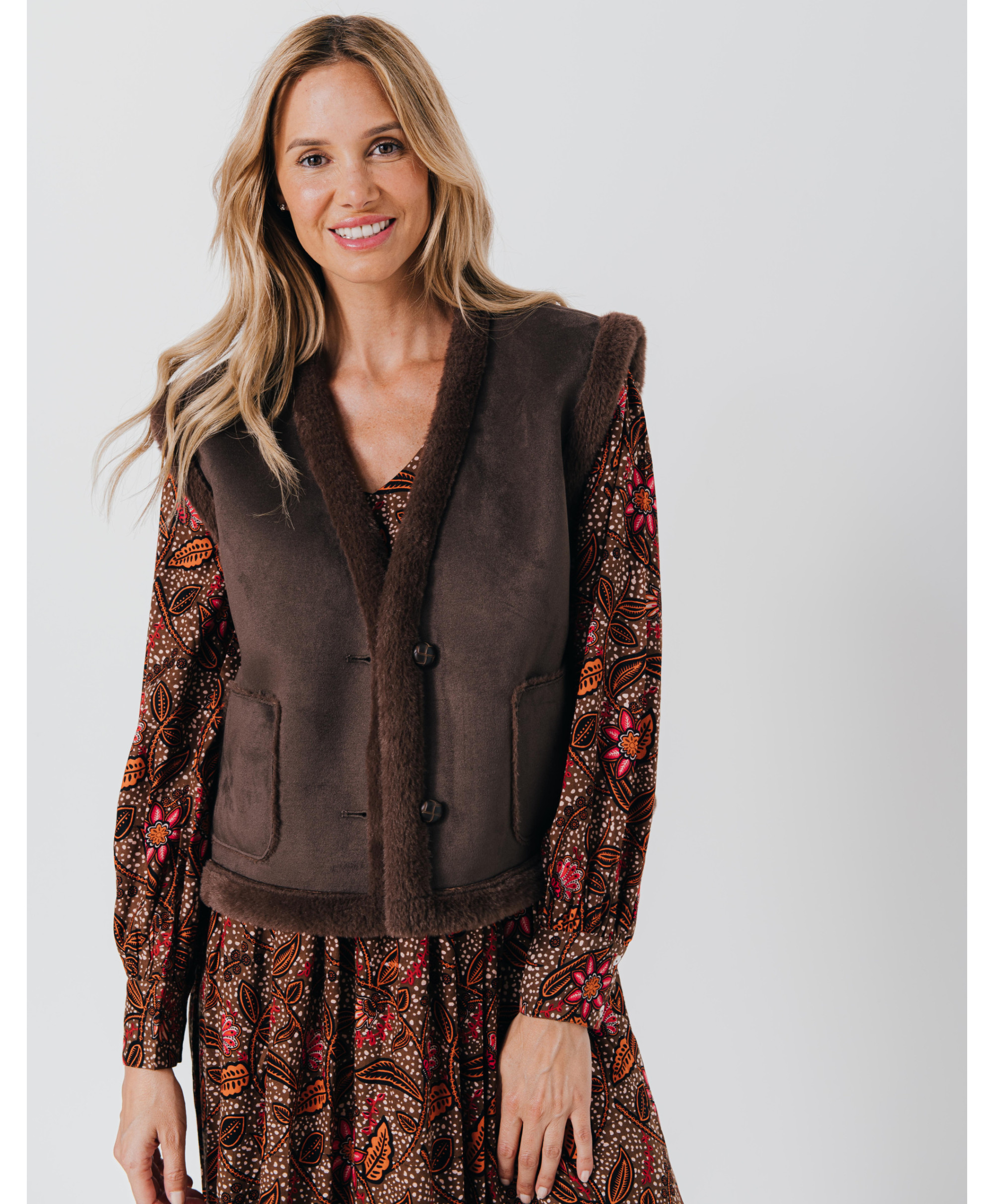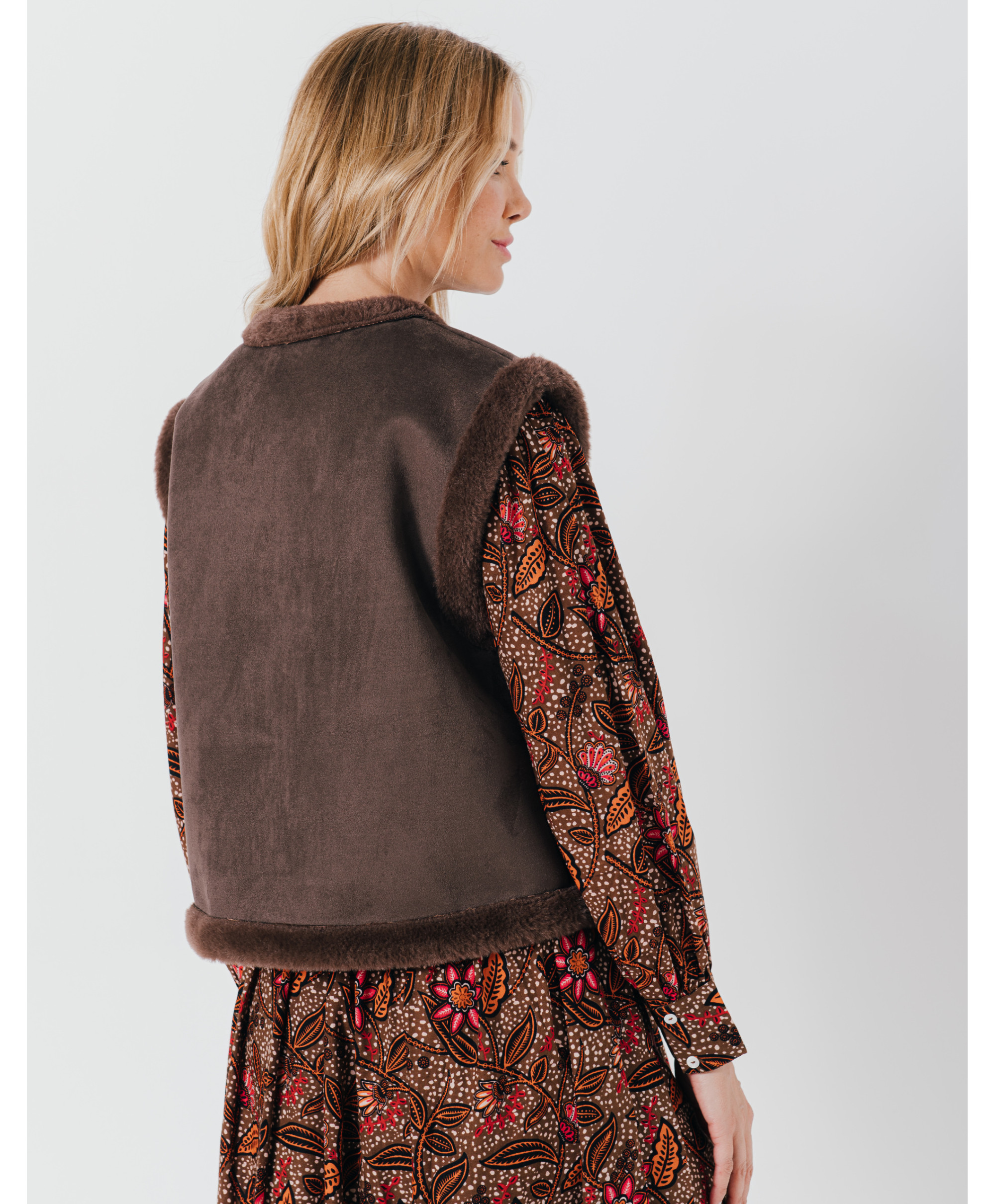 Notre veste kimono sans manches en peau lainée va vite devenir votre atout mode. Craquant pour le côté douillet de l'aspect peau lainée sherpa et pour la douceur du tissu suédé, elle a tout bon !