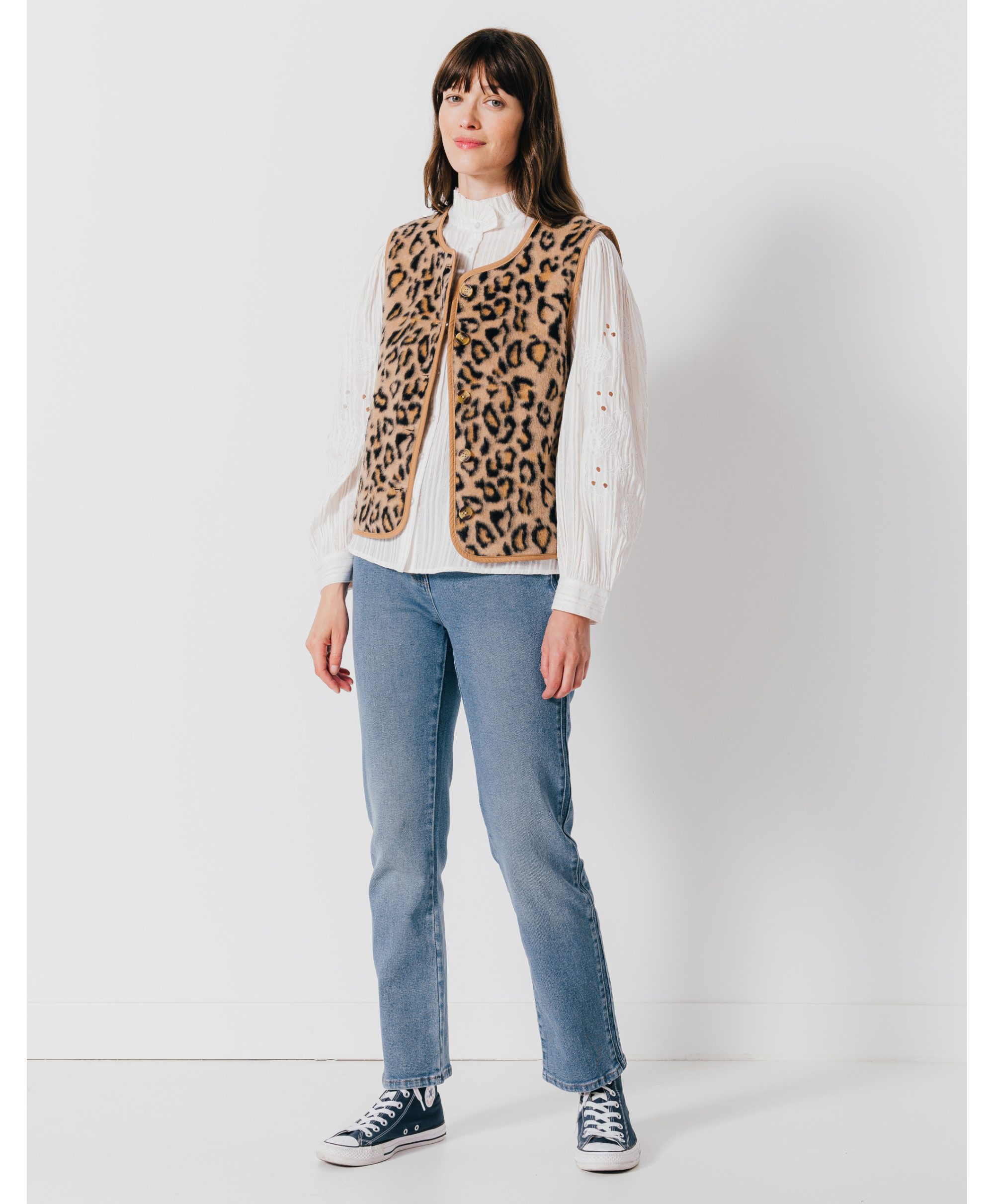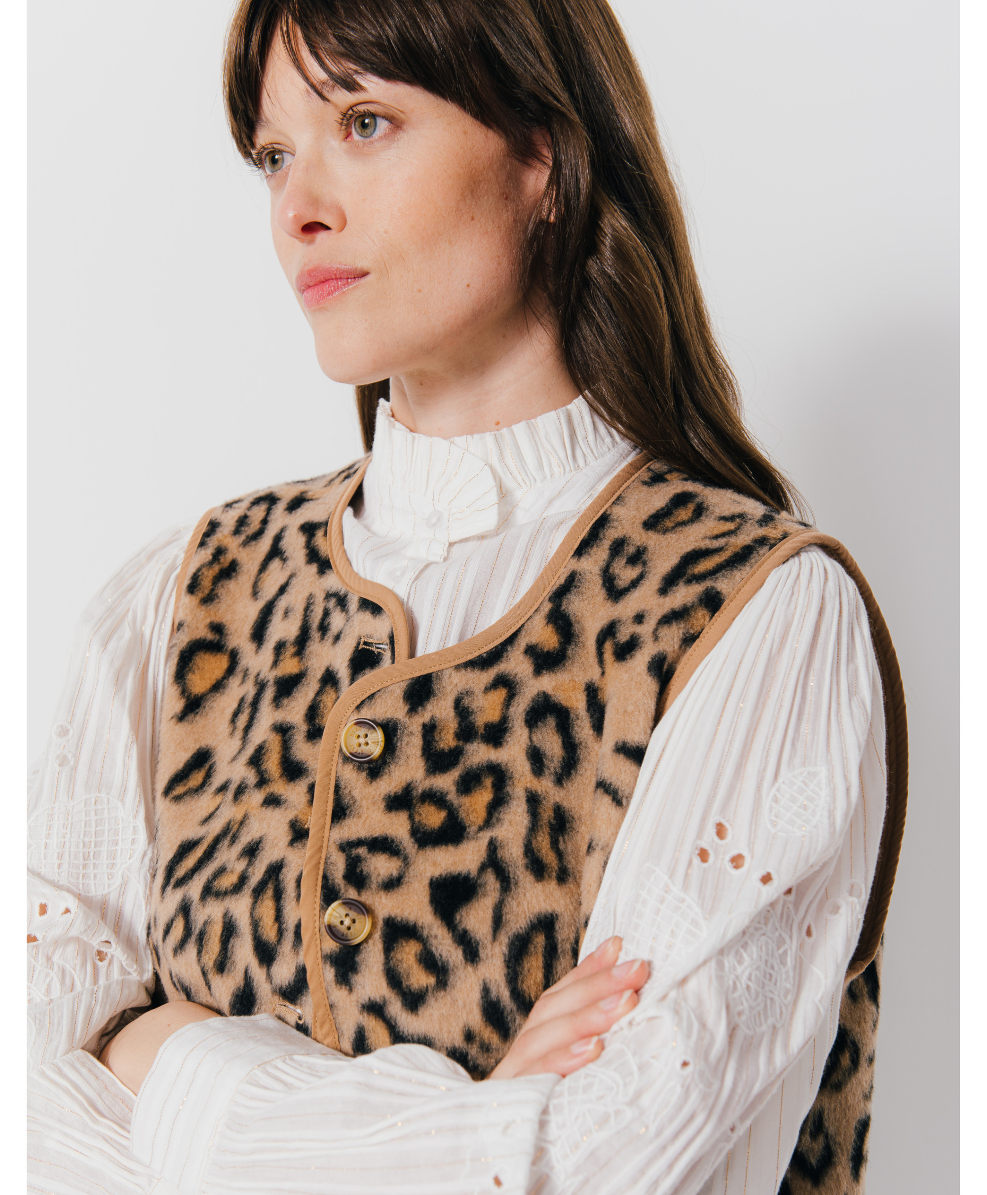 Avec ce superbe gilet sans manches peau de bête vous aurez hâte de le porter dès le début de saison ! On l'aime pour sa matière en bouclette et ses boutons corne et ses bandes contrastantes. On le porte avec un pantalon large et une blouse brodée.