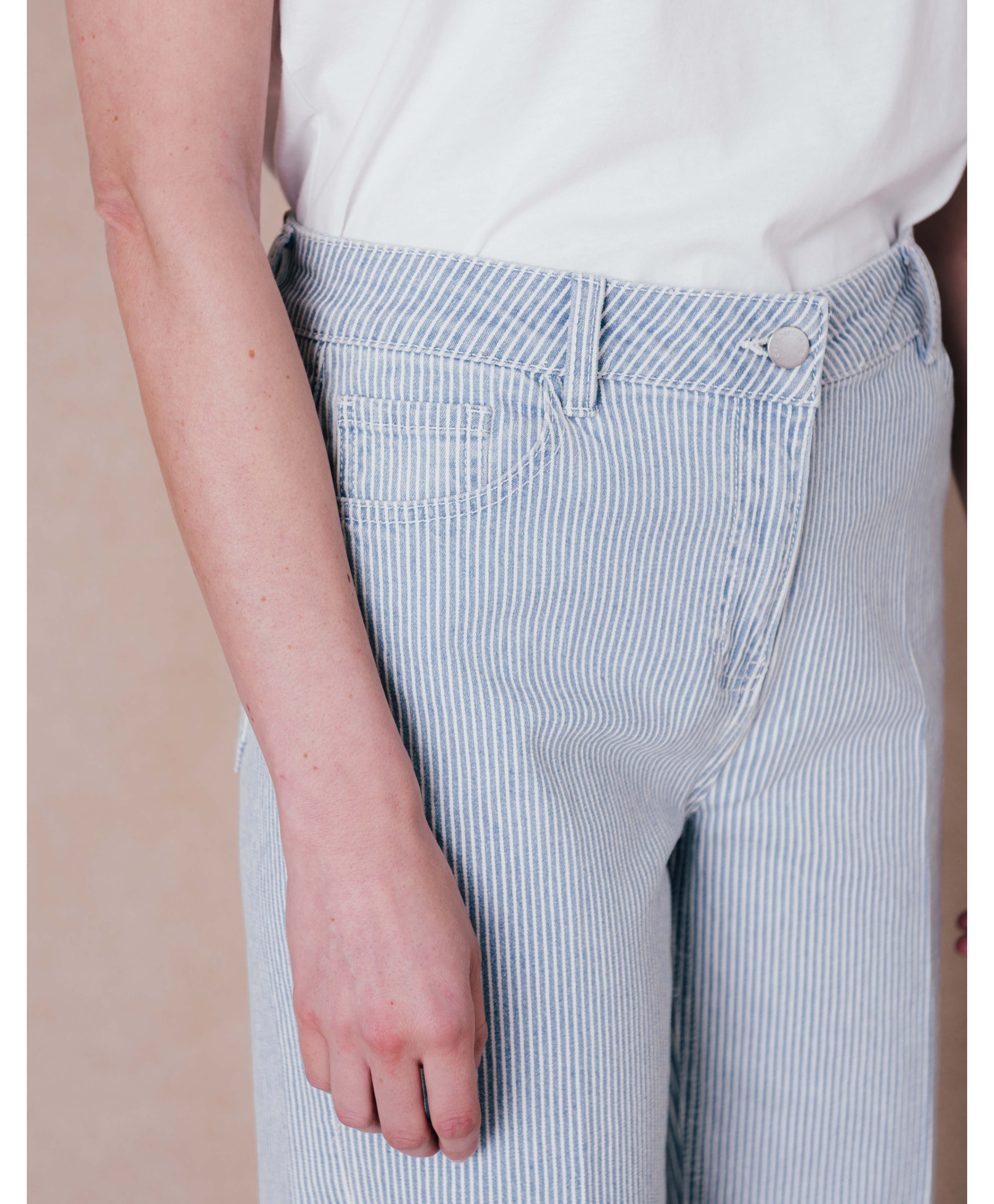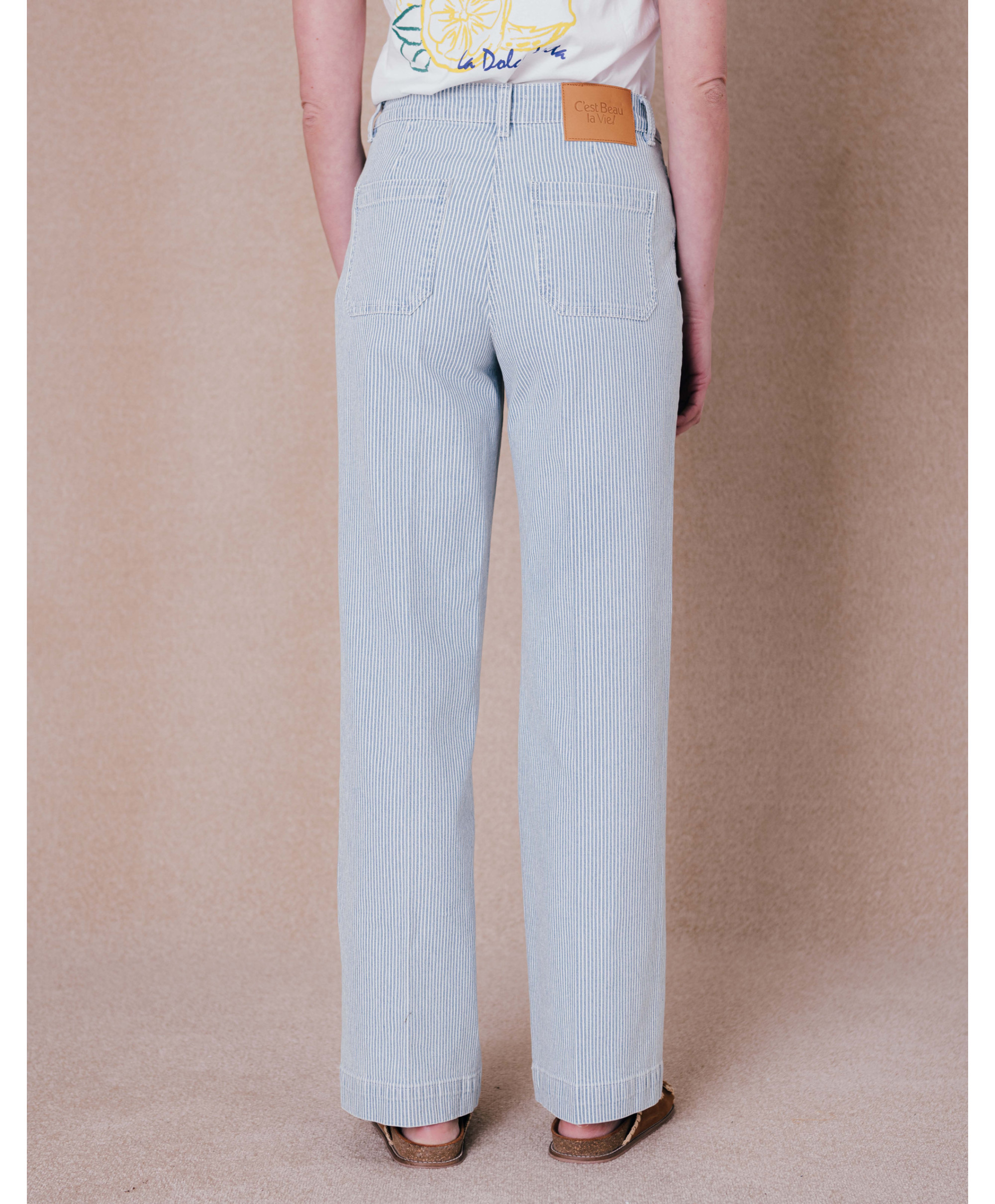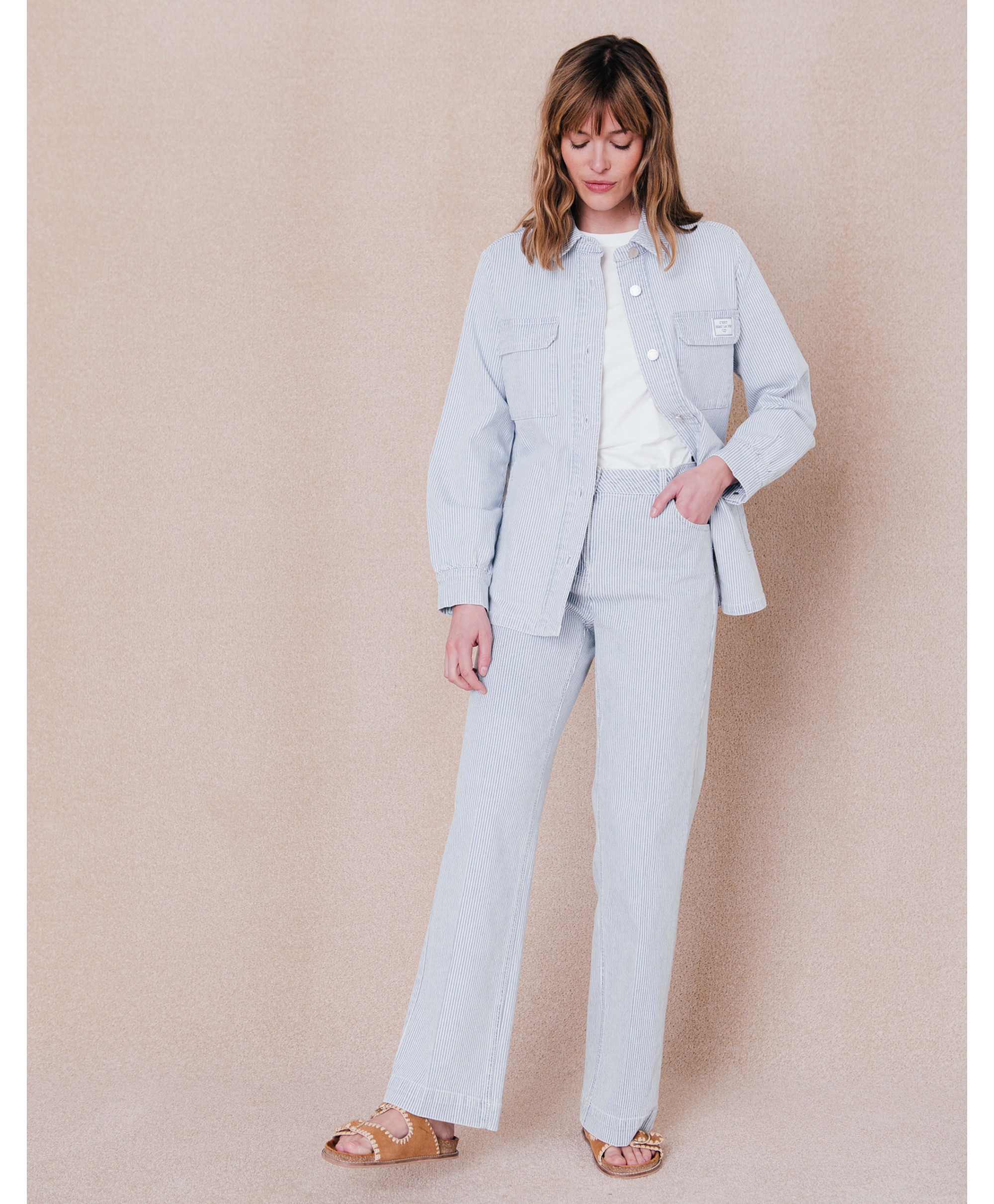 Le nouveau jean de la saison qui va devenir l'intemporel du vestiaire d'été. Avec sa coupe large et ses fines rayures, il s’adapte à toutes les situations et s’accorde aussi bien avec un chemisier et des