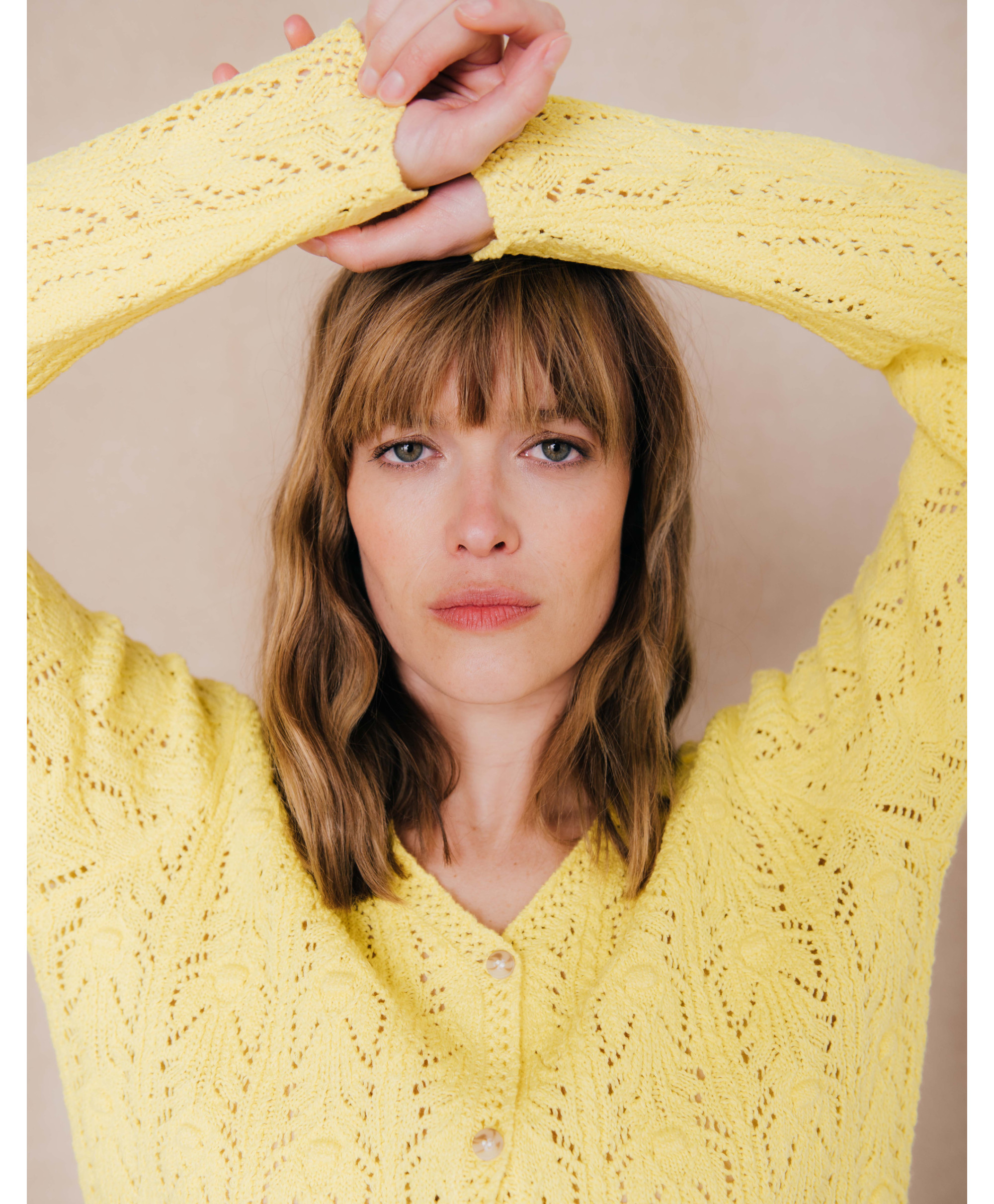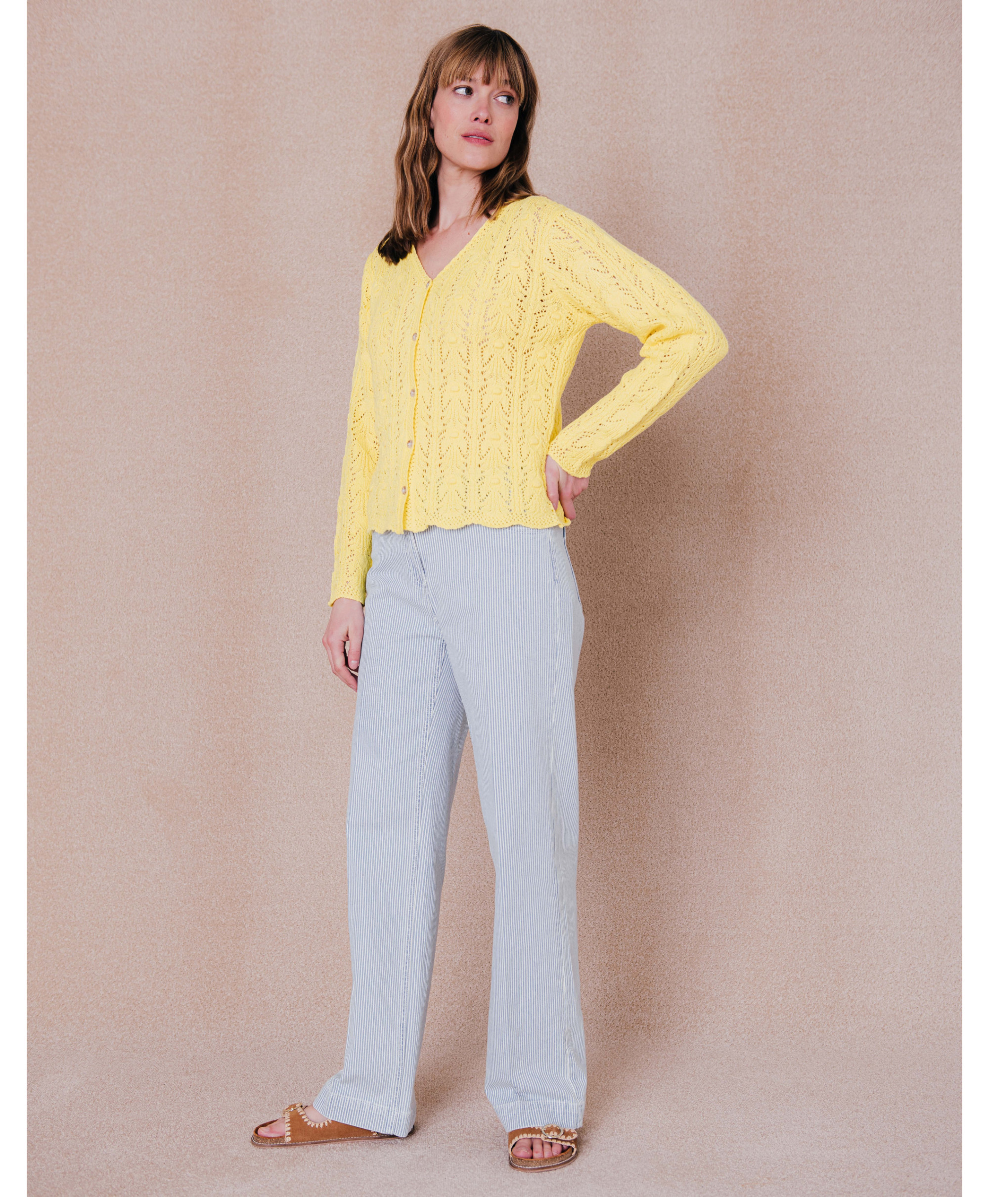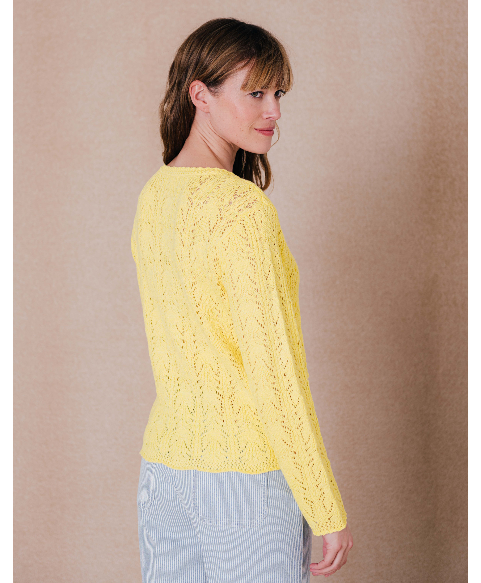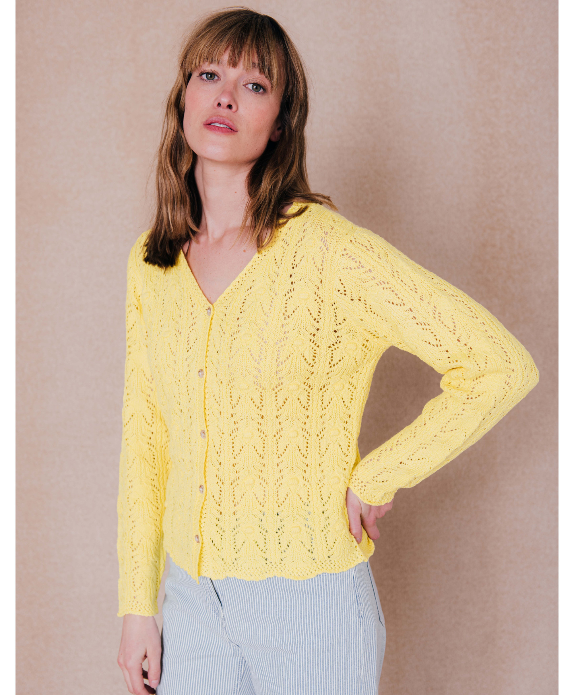 On aime ce gilet confectionné dans une maille ajourée délicate. Parfait sur une jupe. Une pièce essentielle du dressing.