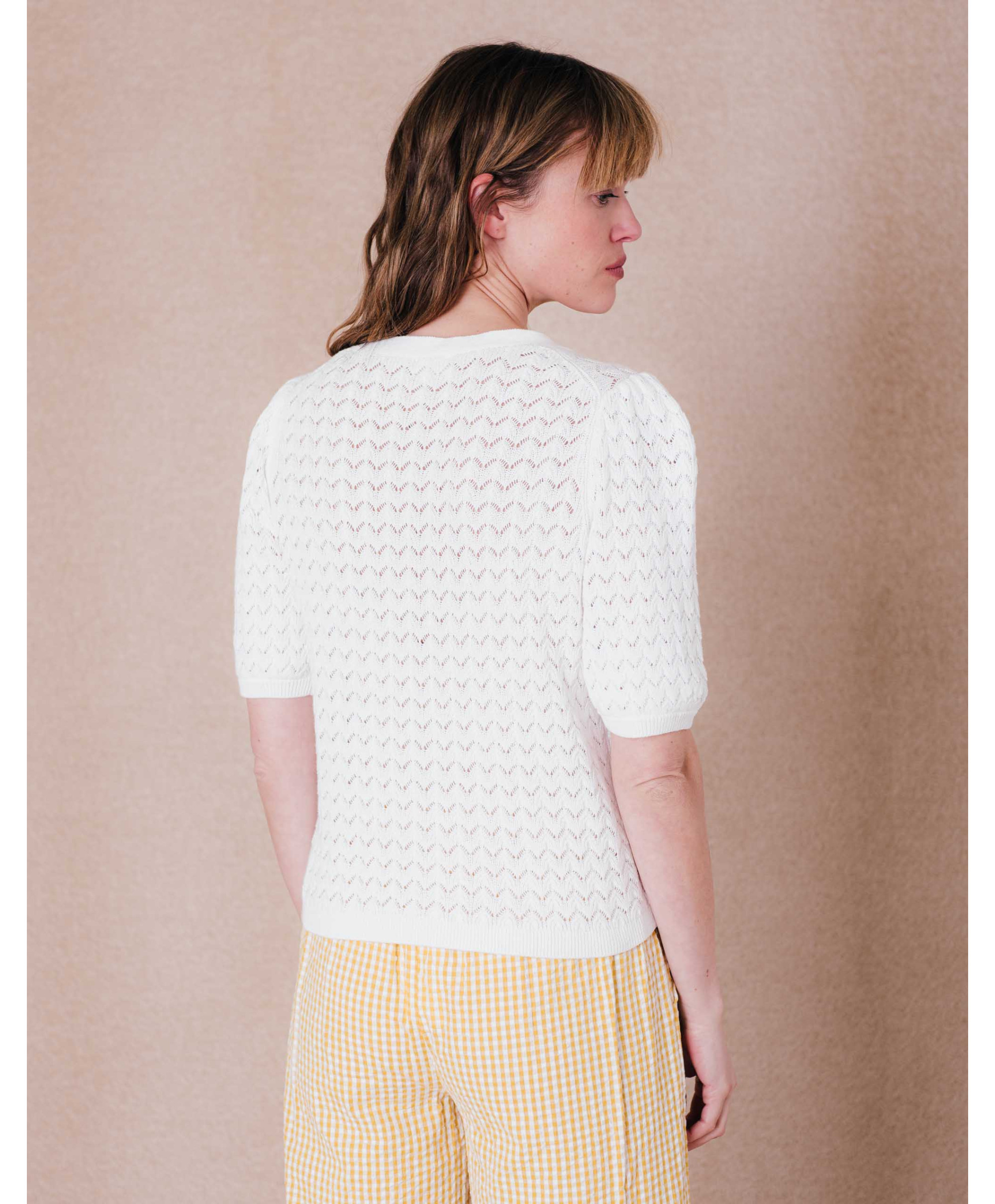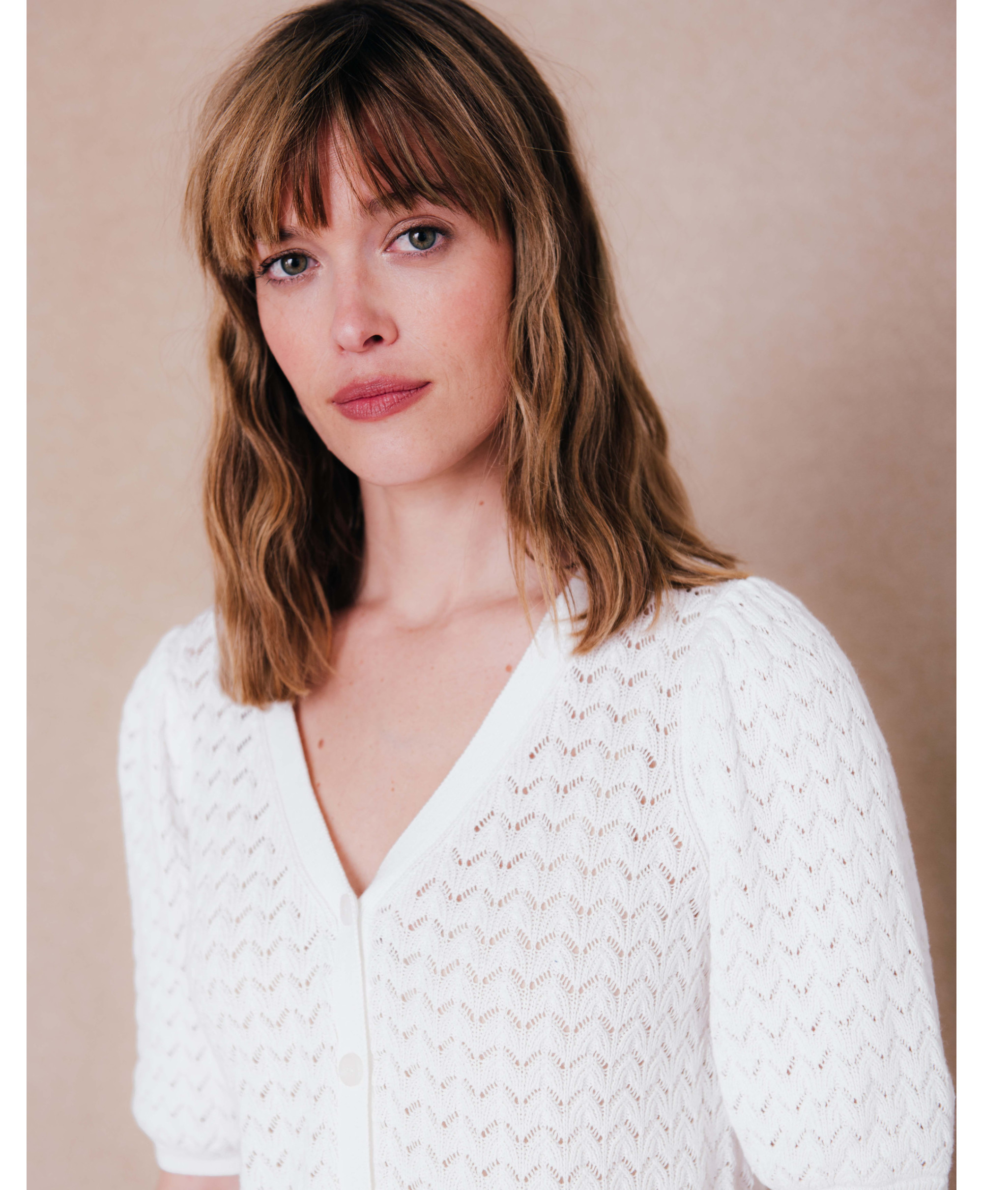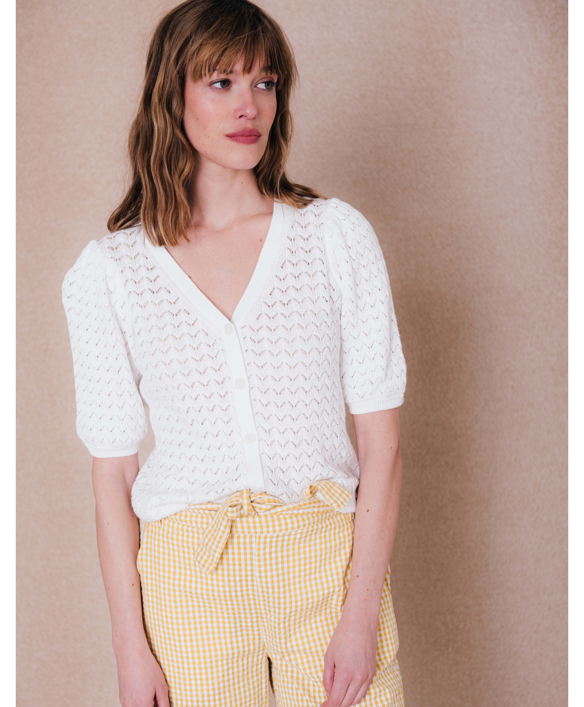 On aime ce gilet confectionné dans une maille ajourée délicate. Parfait sur une jupe. Une pièce essentielle du dressing.