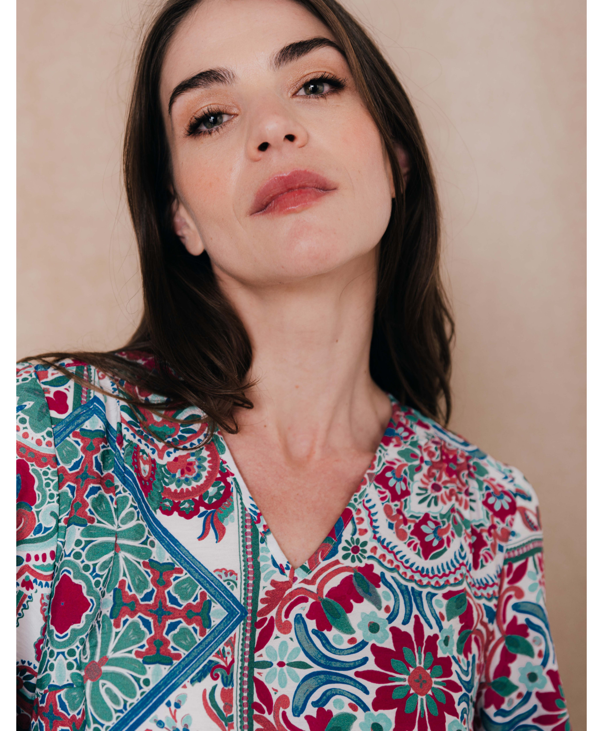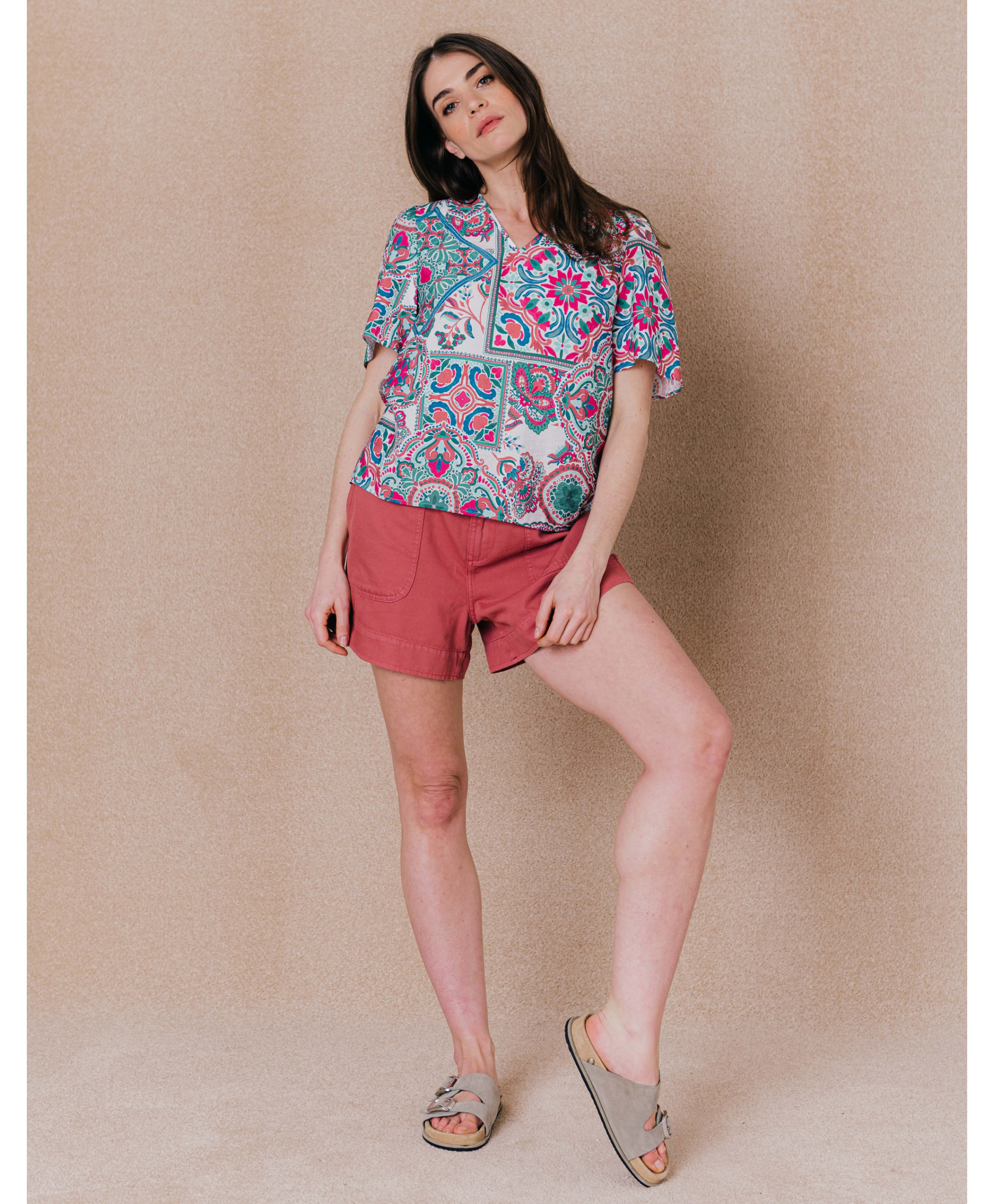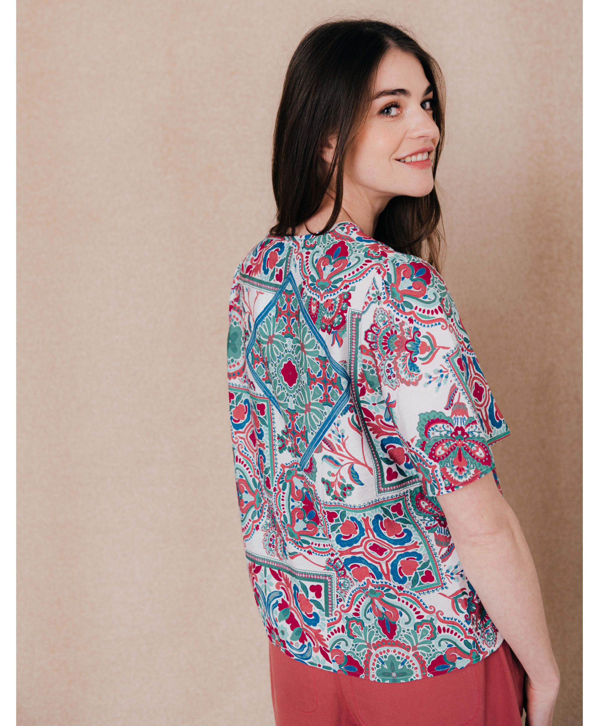 On craque pour notre blouse imprimée très colorée, très agréable pour le plein été. On l'aime pour la légèreté de sa matière et ses froufrous.