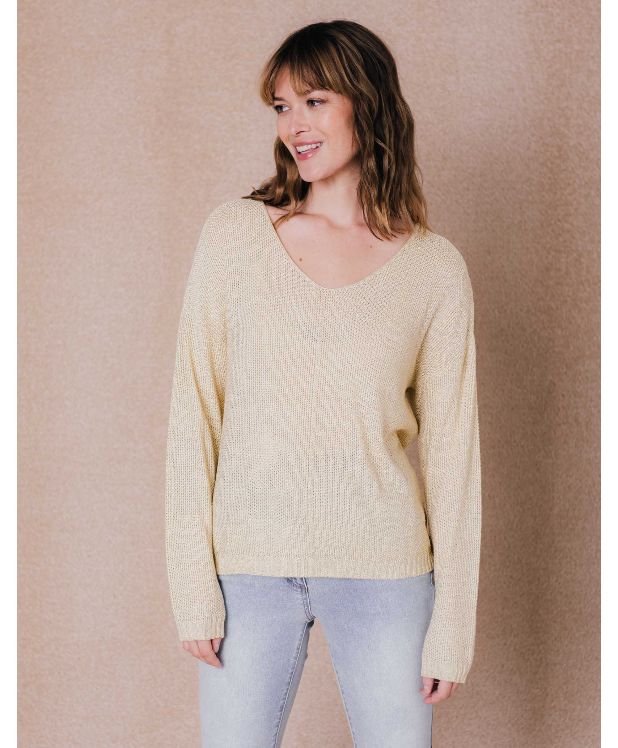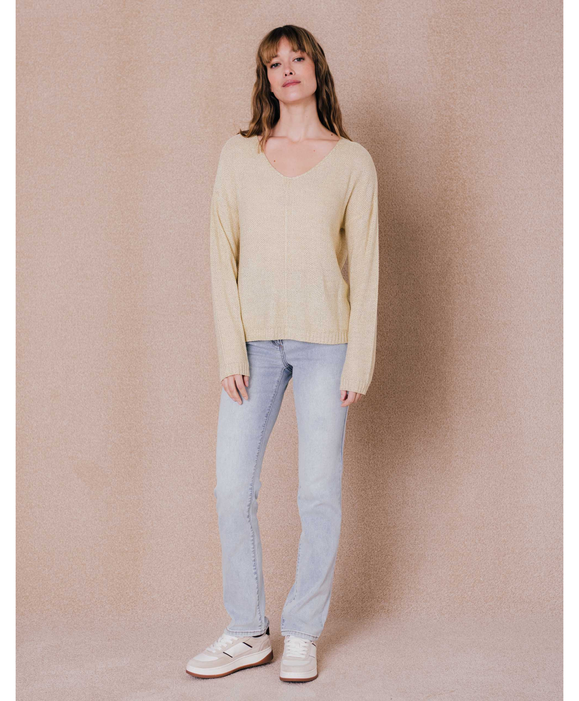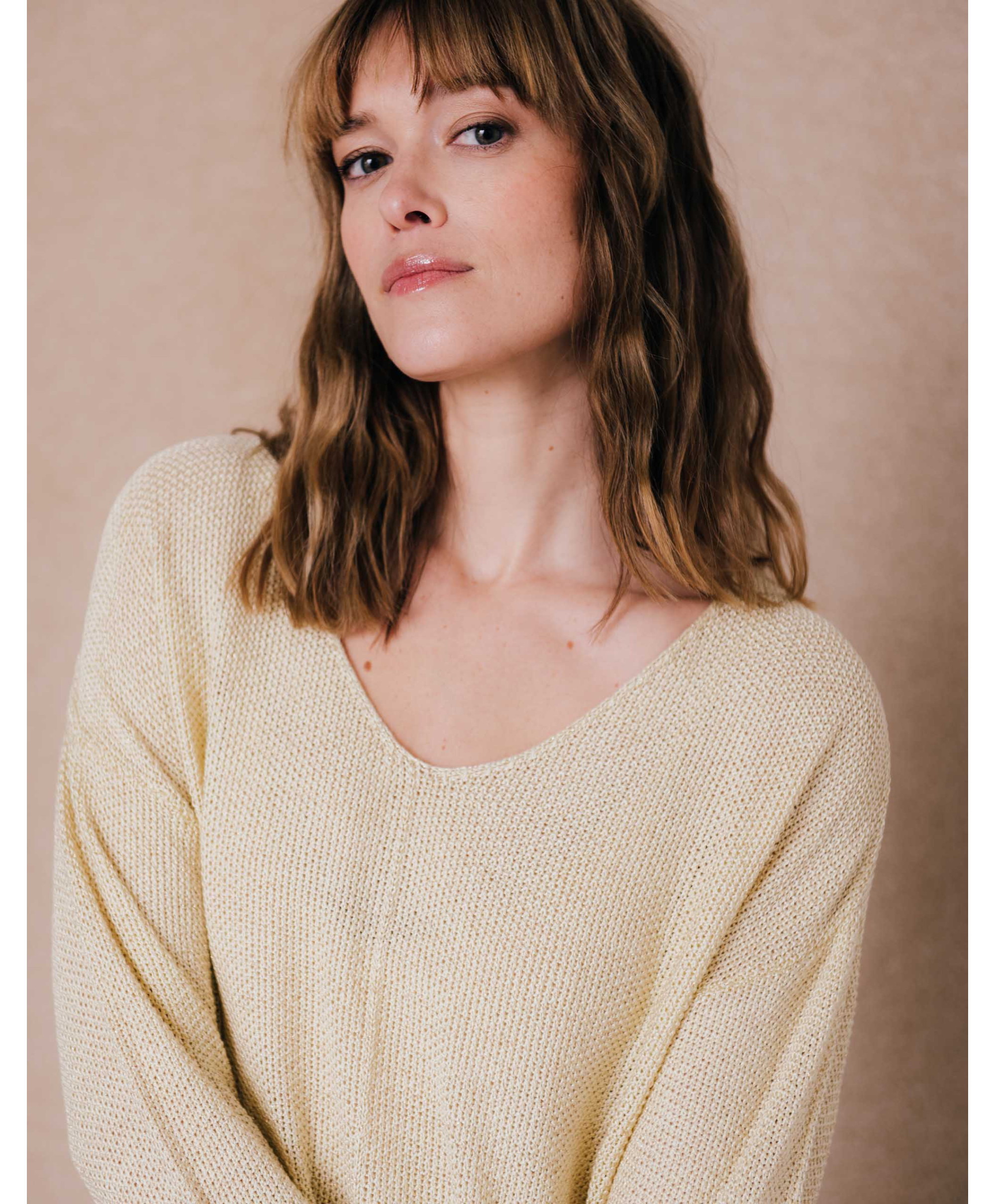 Glissez-vous dans notre pull ajouré et lurex, indispensable de la saison. Avec son col V, ses manches longues et sa maille fantaisie, il est douillet à souhait.