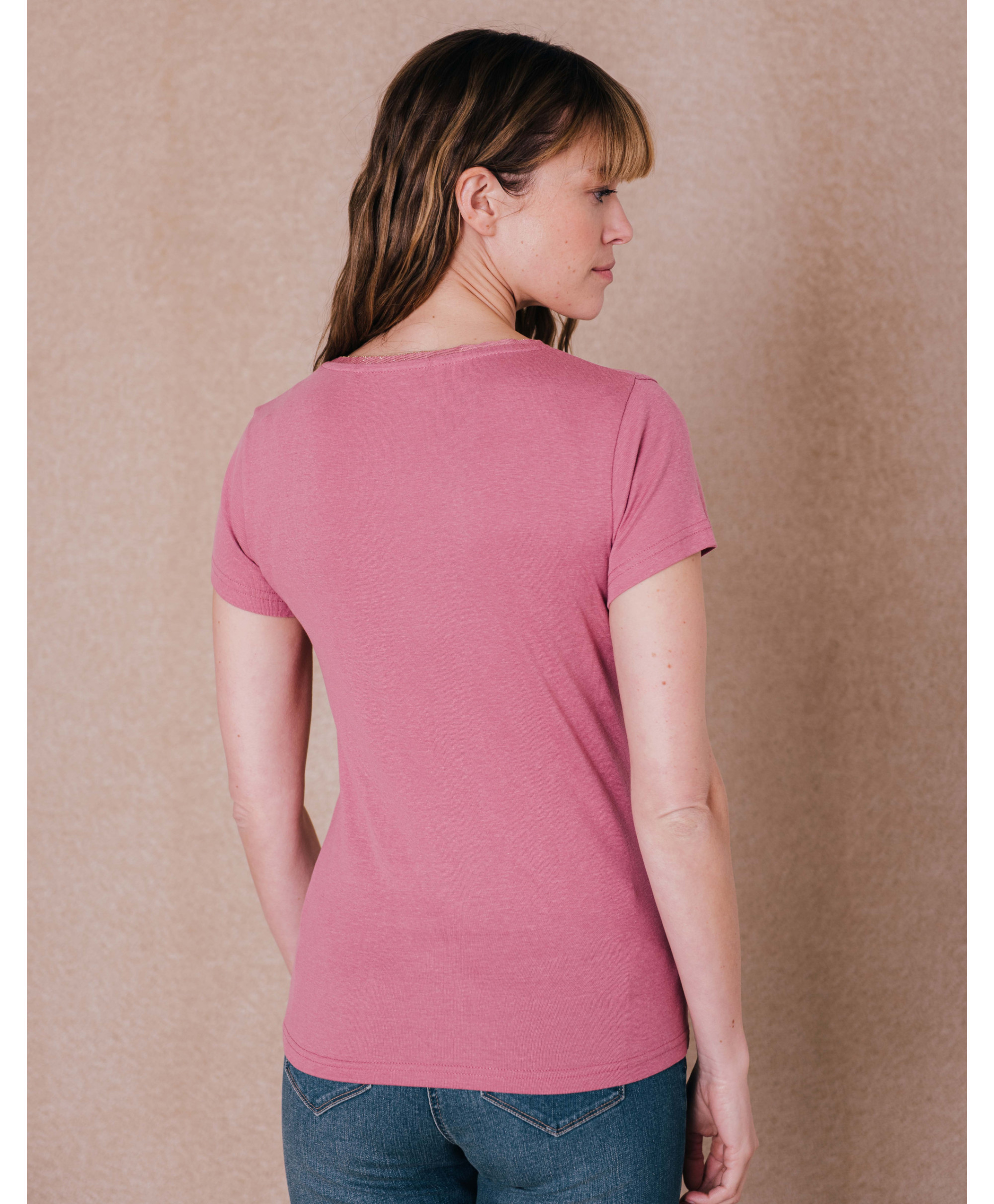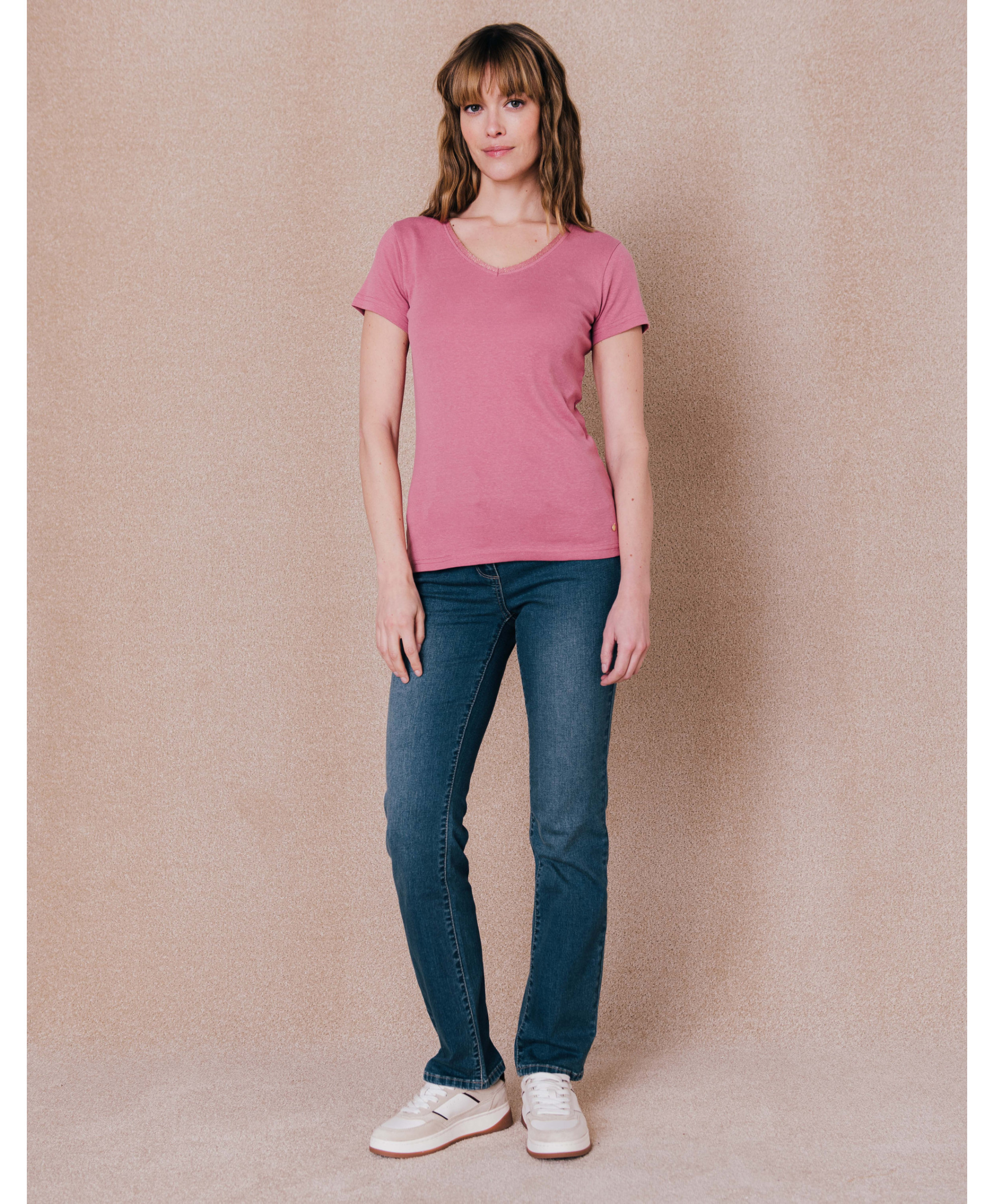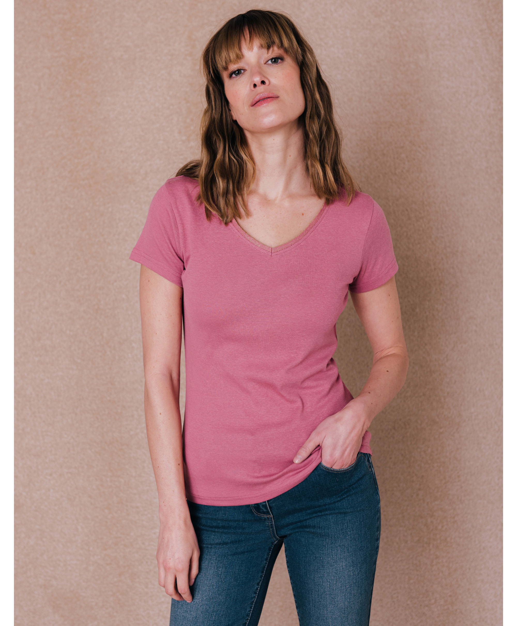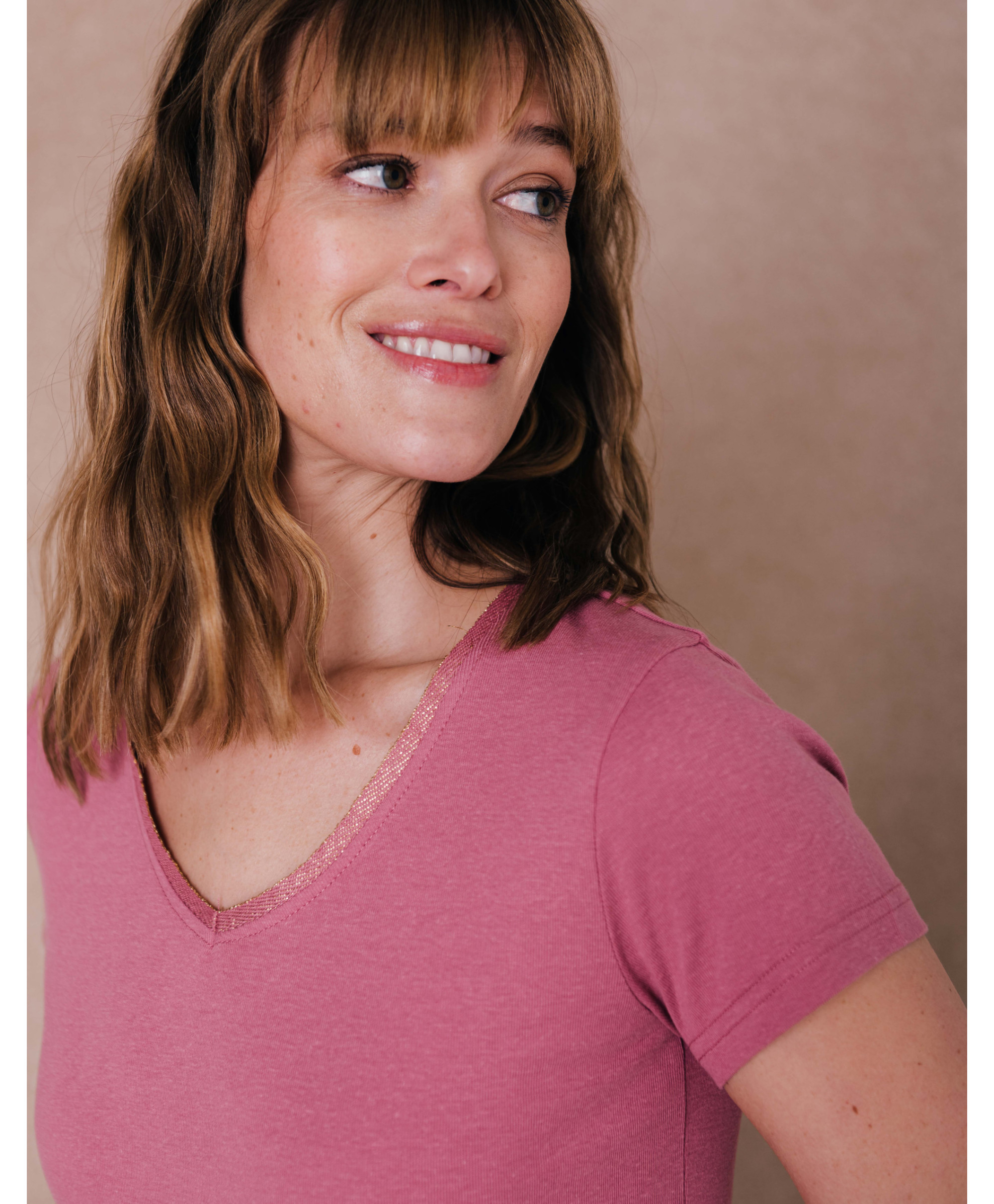 Un tee-shirt à manches courtes à porter en toutes circonstances, seul ou sous un gilet ou une veste. Il affiche un col en V à finitions lurex.