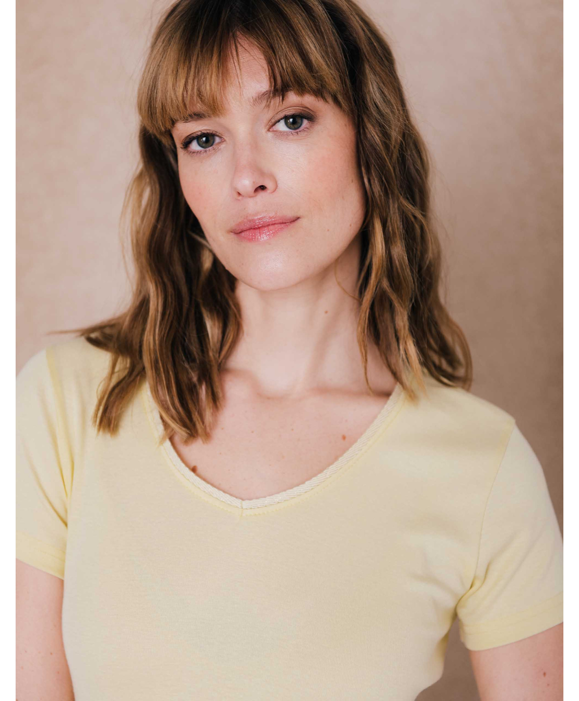 Un tee-shirt à manches courtes à porter en toutes circonstances, seul ou sous un gilet ou une veste. Il affiche un col en V à finitions lurex.