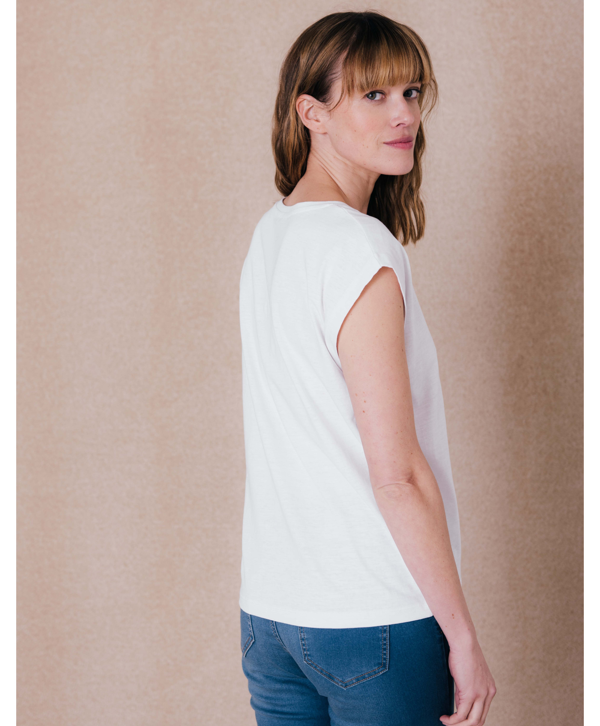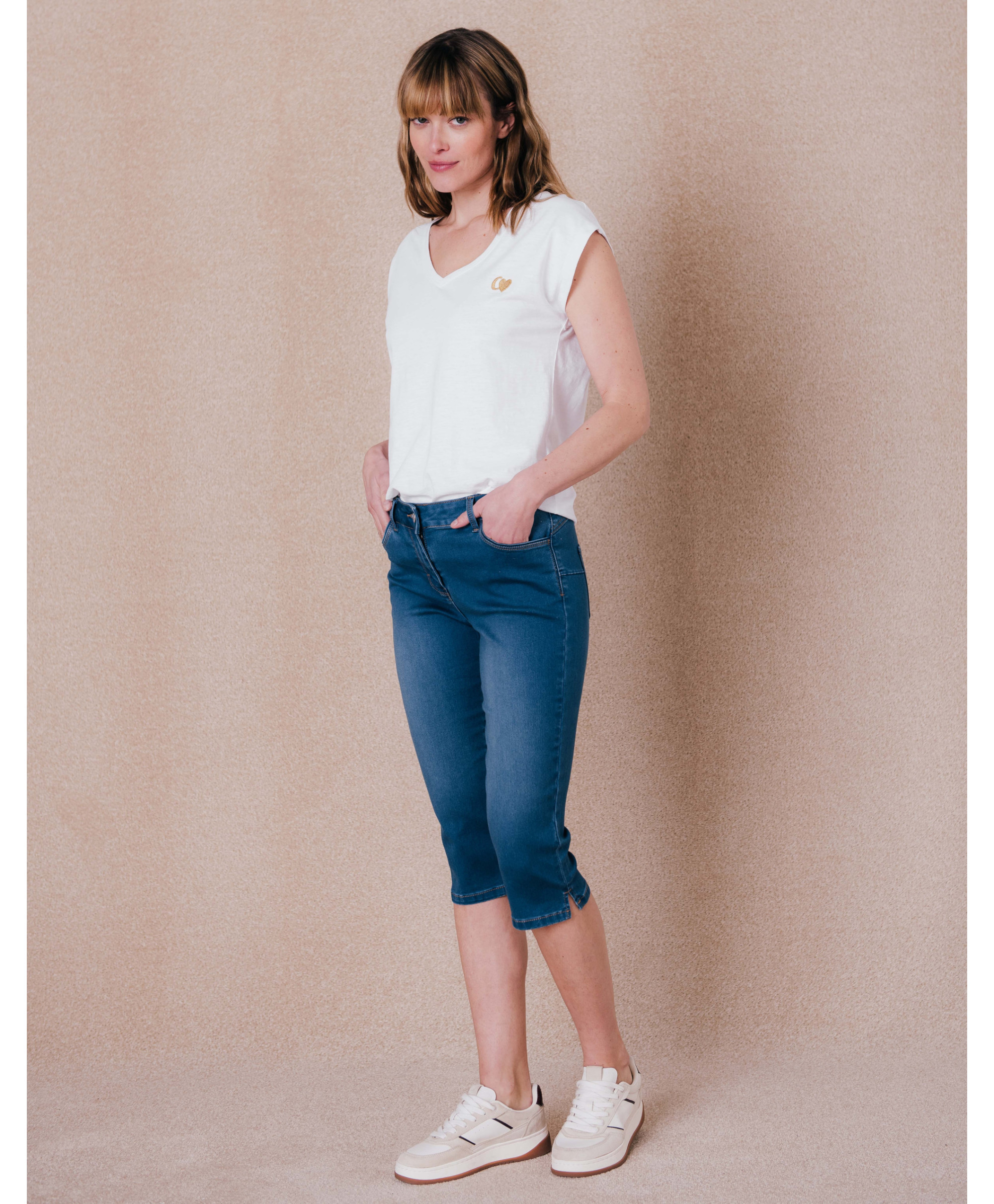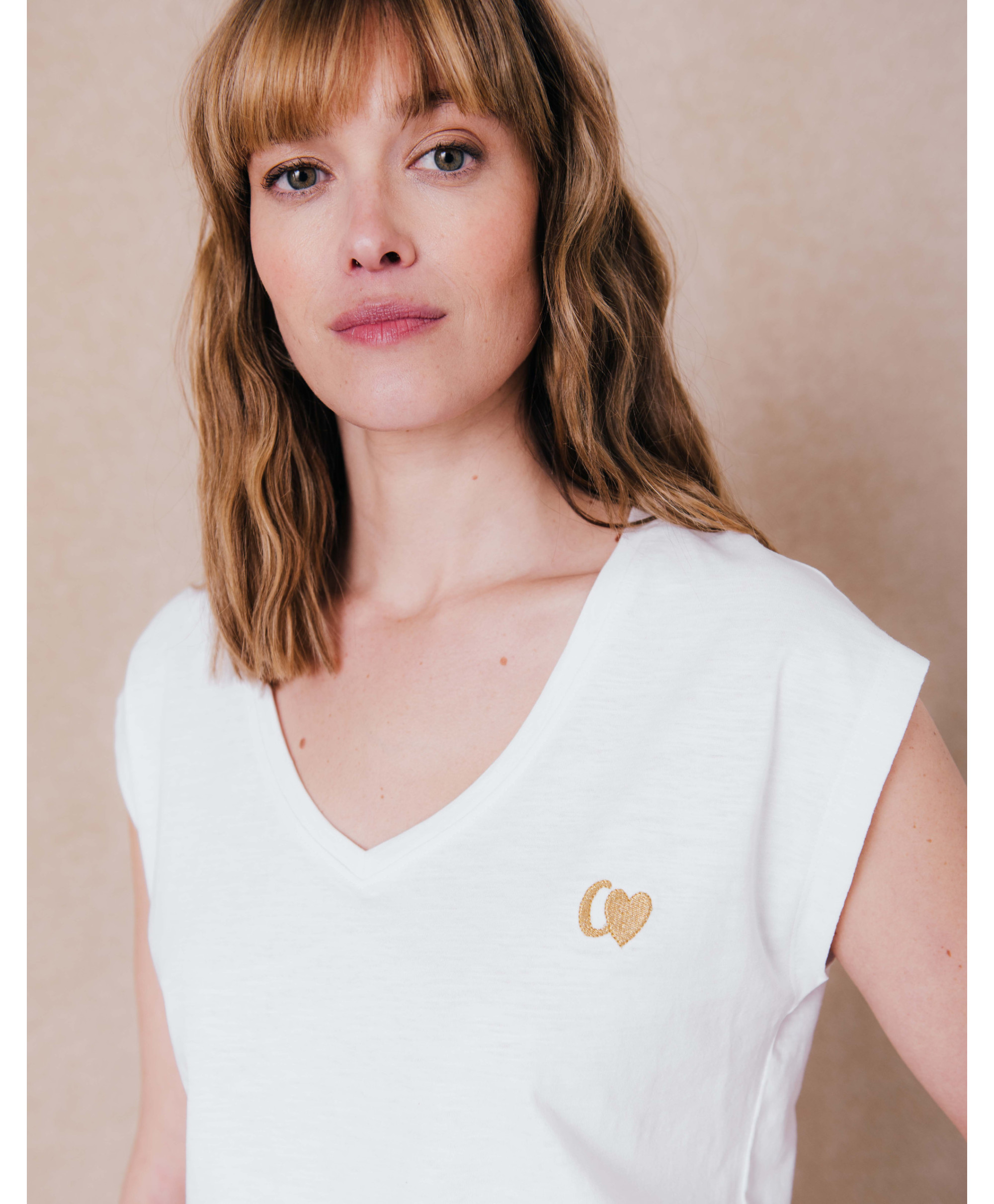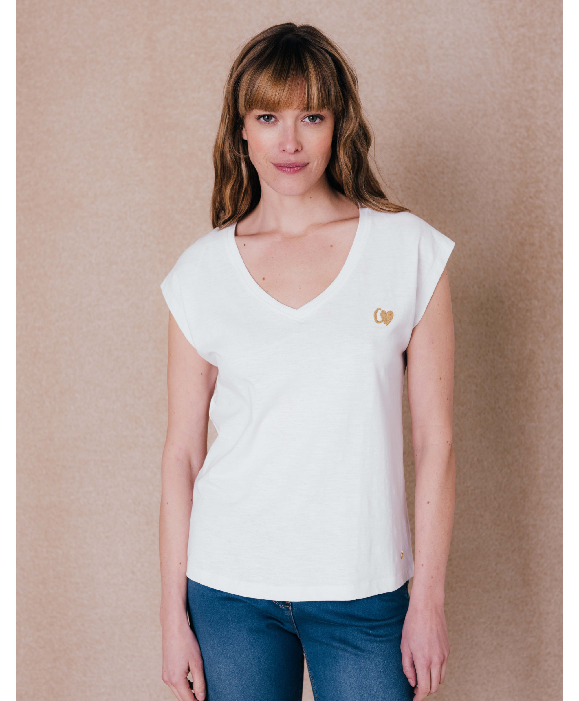 Un tee-shirt à manches courtes à porter en toutes circonstances, seul ou sous un gilet ou une veste. Il affiche un col en V et une matière effet flammé. Un cœur brodé vient féminiser le haut.