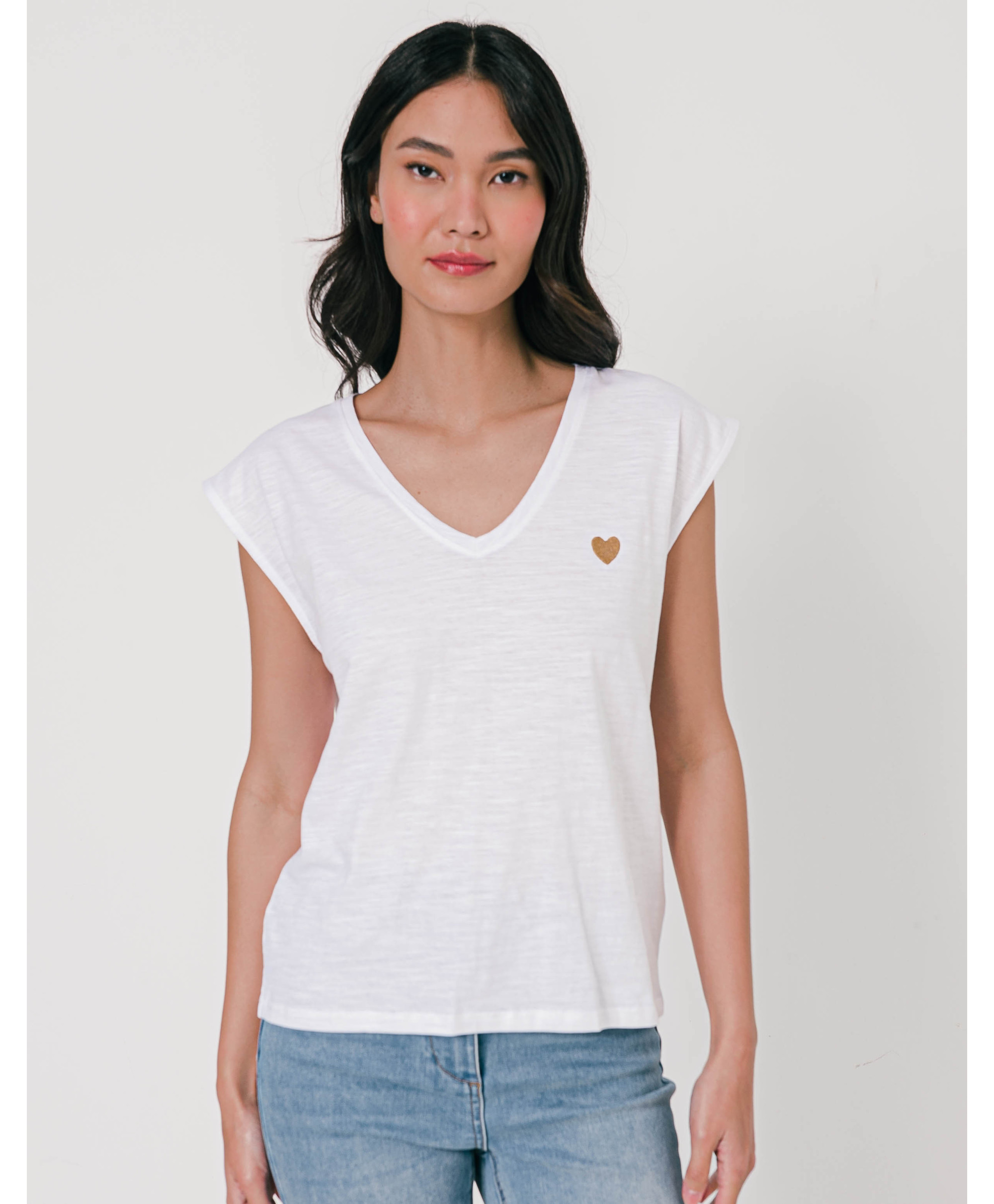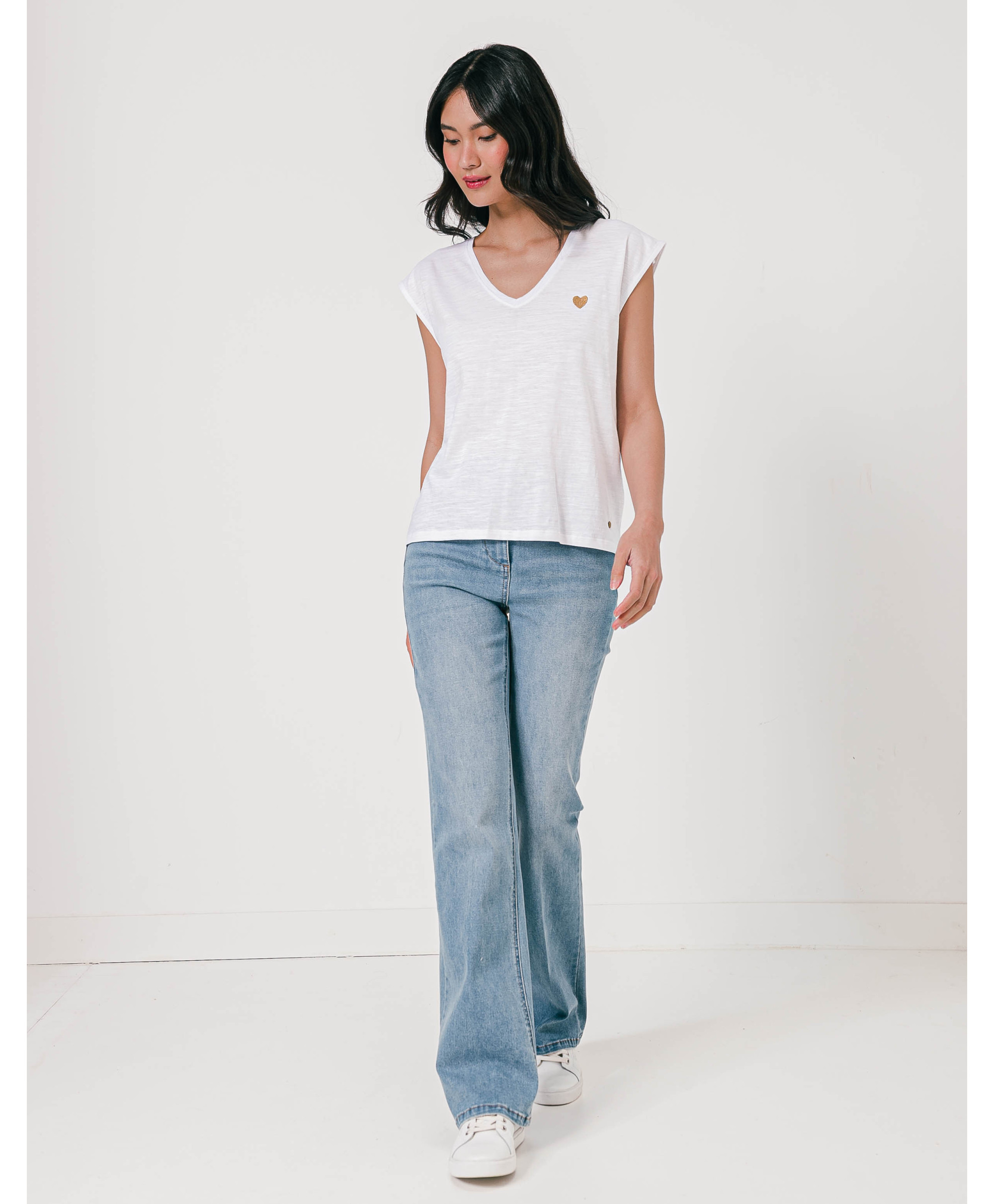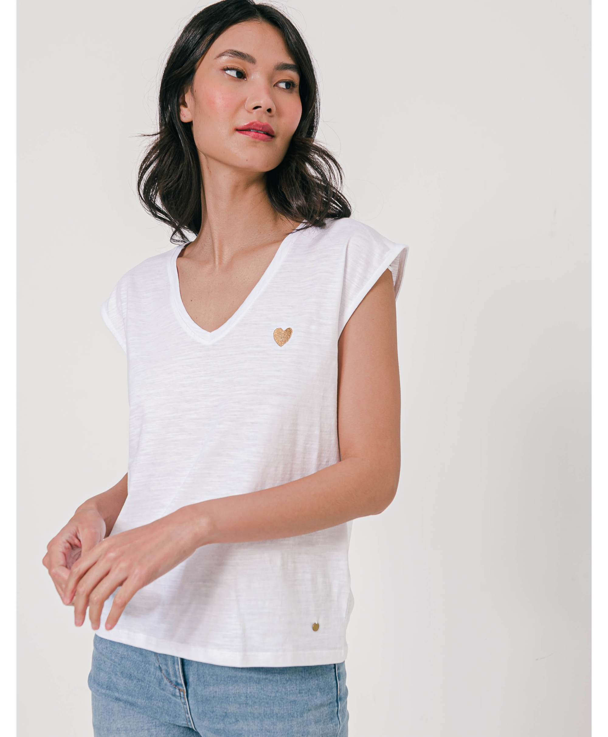 Un tee-shirt à manches courtes à porter en toutes circonstances, seul ou sous un gilet ou une veste. Il affiche un col en V et une matière effet flammé. Un cœur brodé vient féminiser le haut. Ce tee-shirt femme en coton offre un maximum de confort et de douceur. Disponible en plusieurs coloris, il est à collectionner !