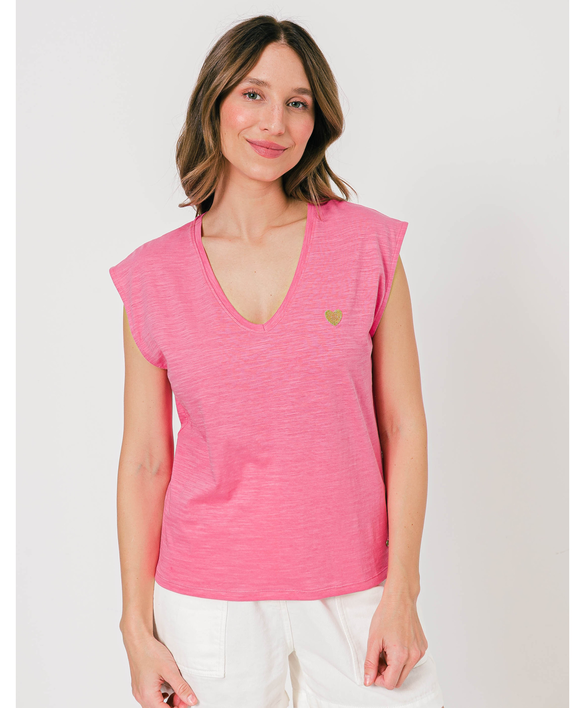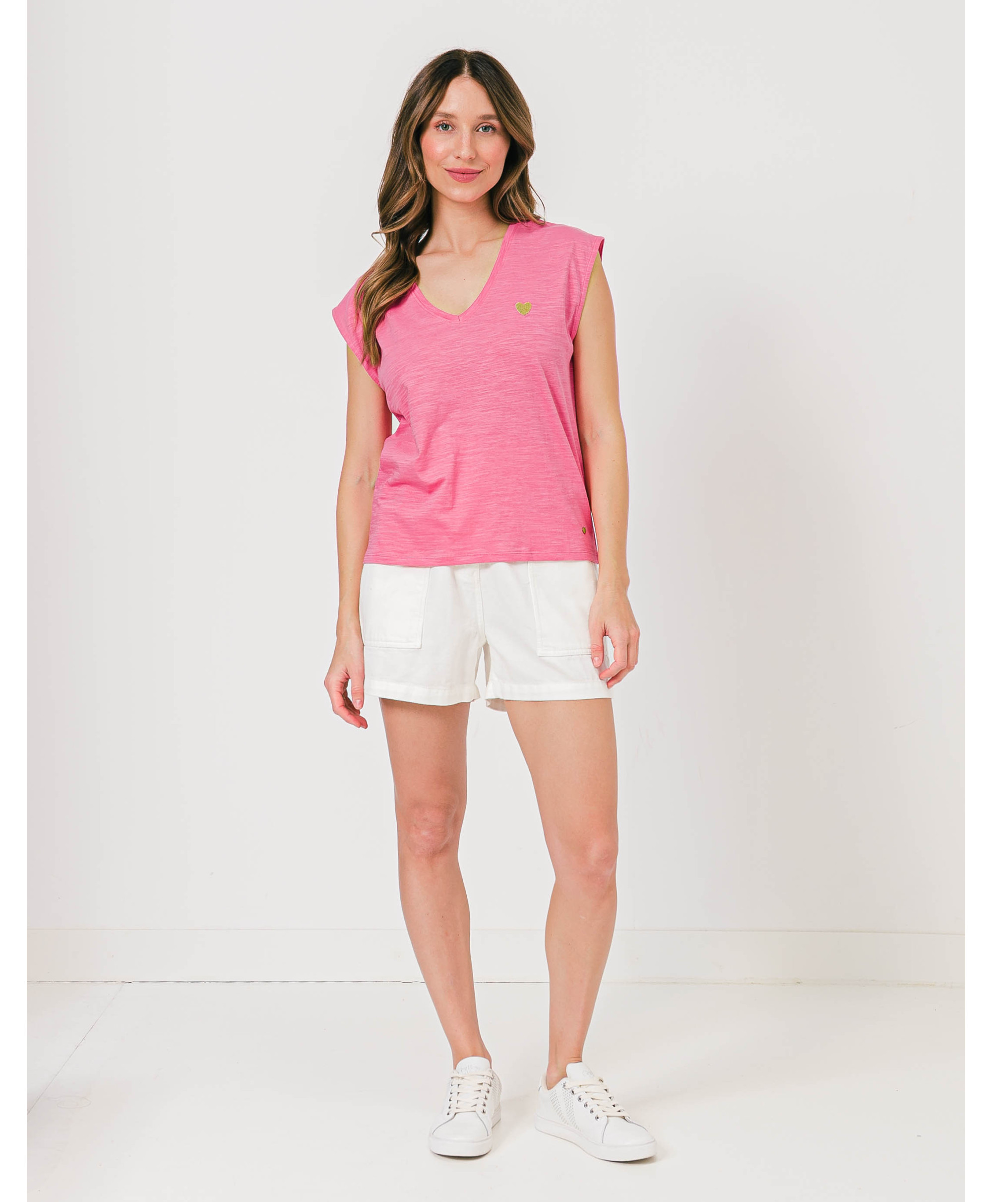 Un tee-shirt à manches courtes à porter en toutes circonstances, seul ou sous un gilet ou une veste. Il affiche un col en V et une matière effet flammé. Un cœur brodé vient féminiser le haut. Ce tee-shirt femme en coton offre un maximum de confort et de douceur. Disponible en plusieurs coloris, il est à collectionner !
