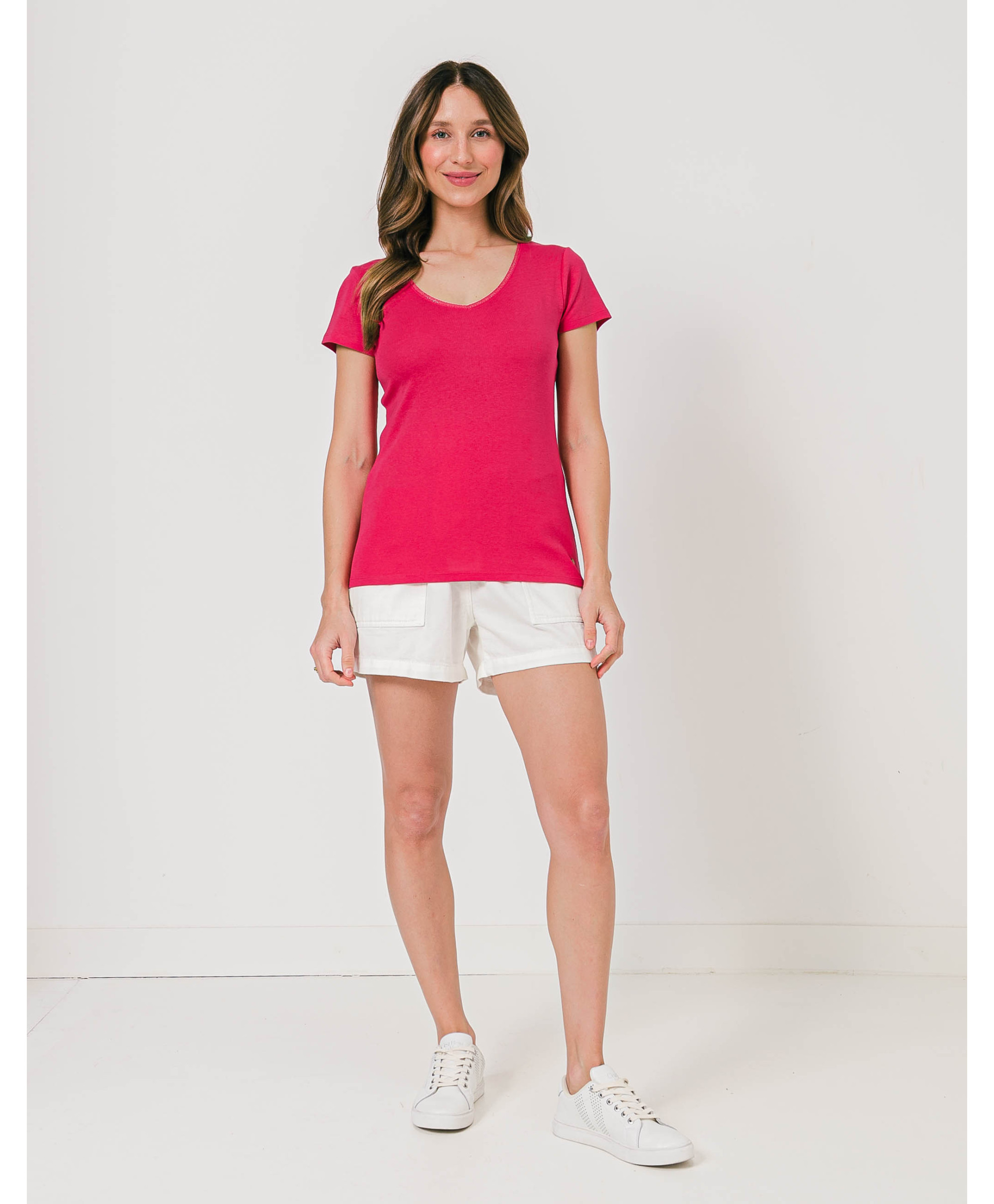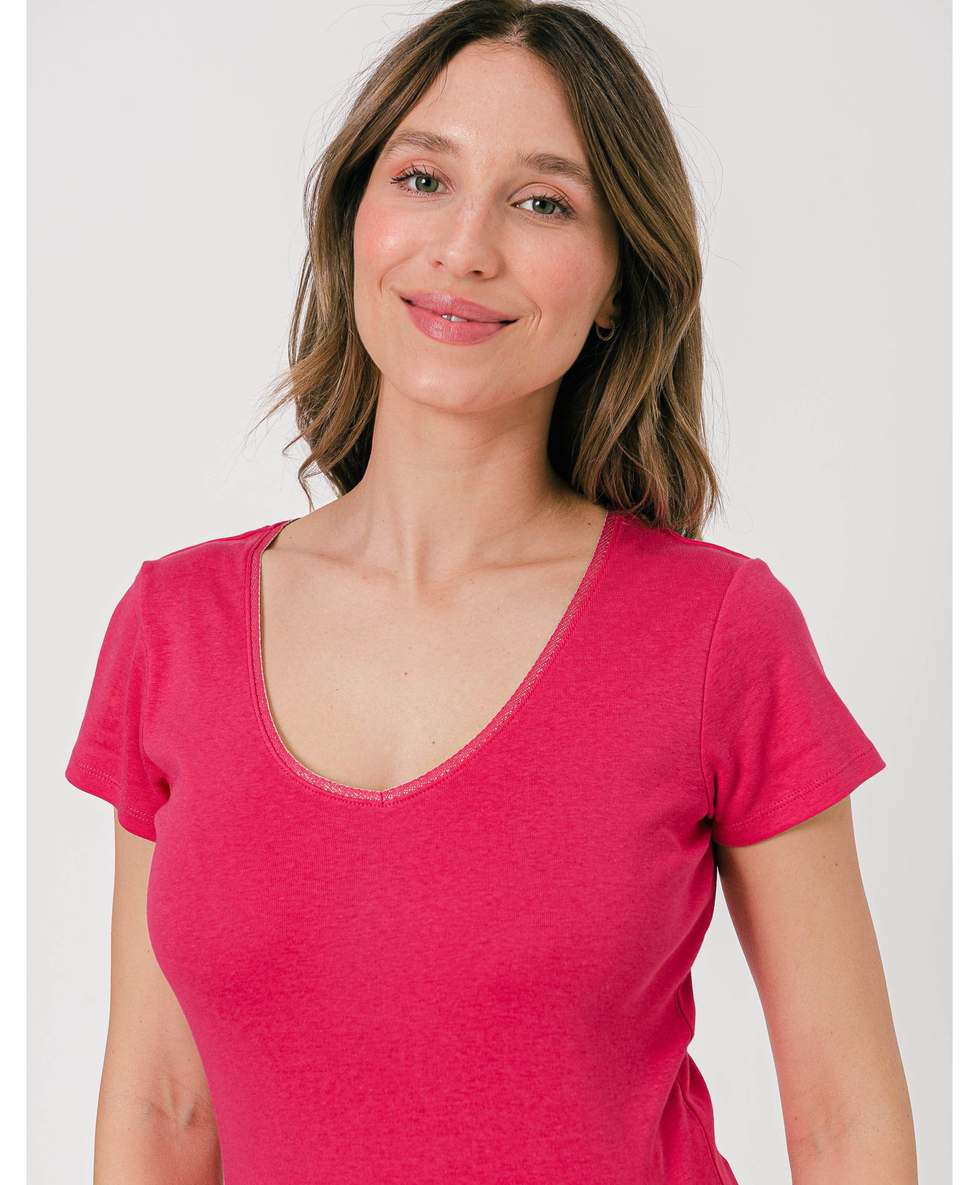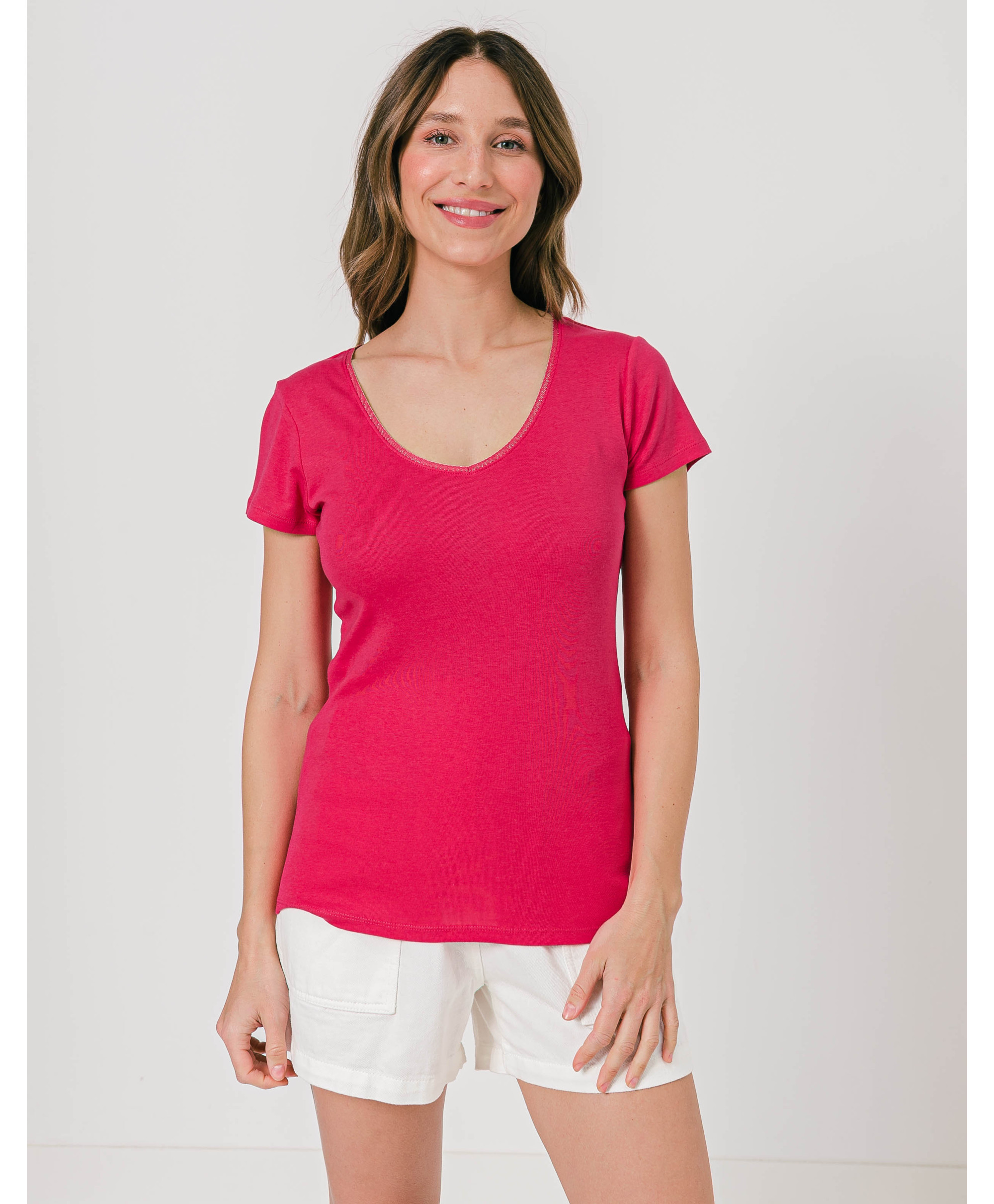 Un tee-shirt à manches courtes à porter en toutes circonstances, seul ou sous un gilet ou une veste. Il affiche un col en V à finitions lurex. Ce tee-shirt femme en coton offre un maximum de confort et de douceur. Disponible en plusieurs coloris, il est à collectionner !