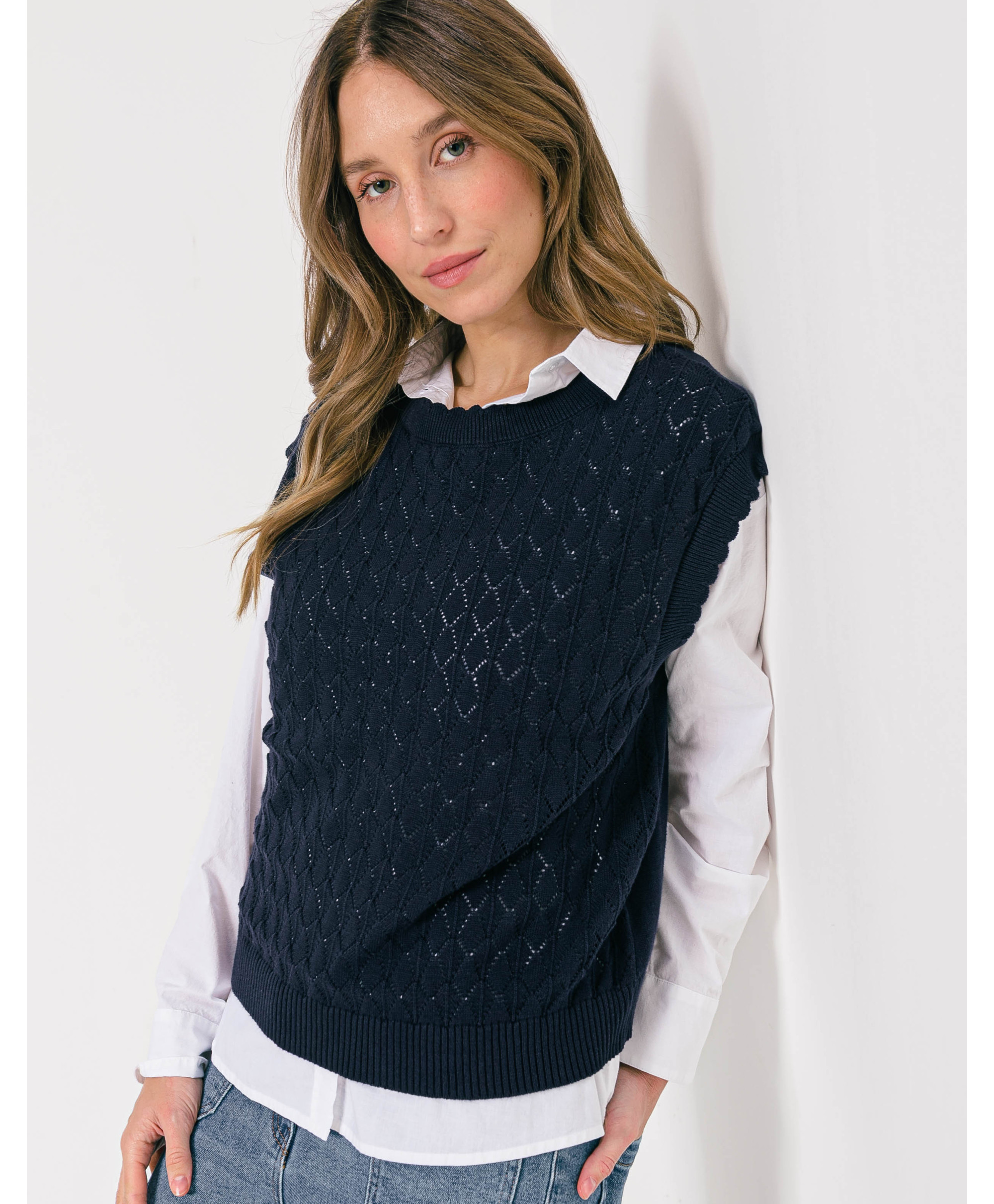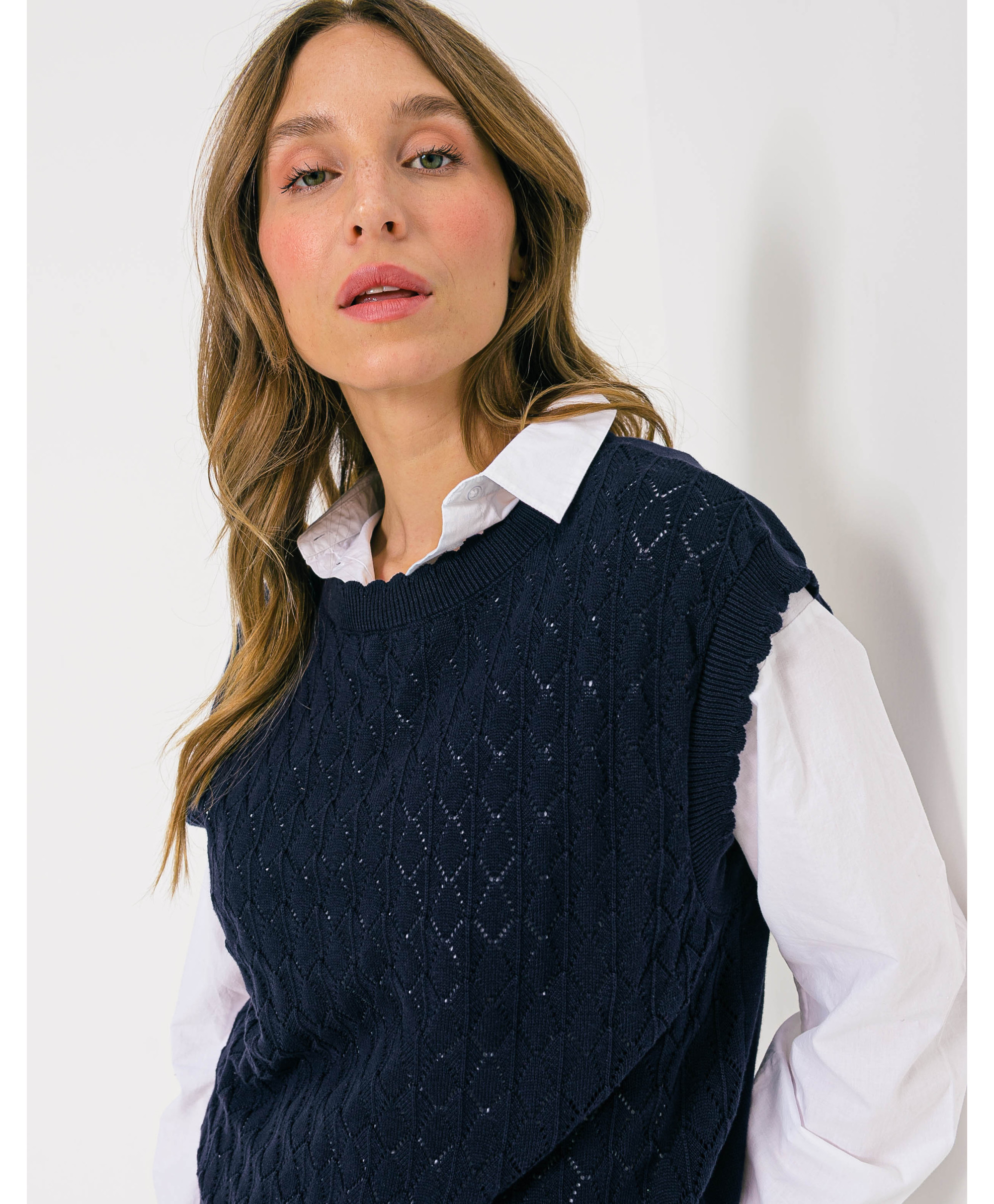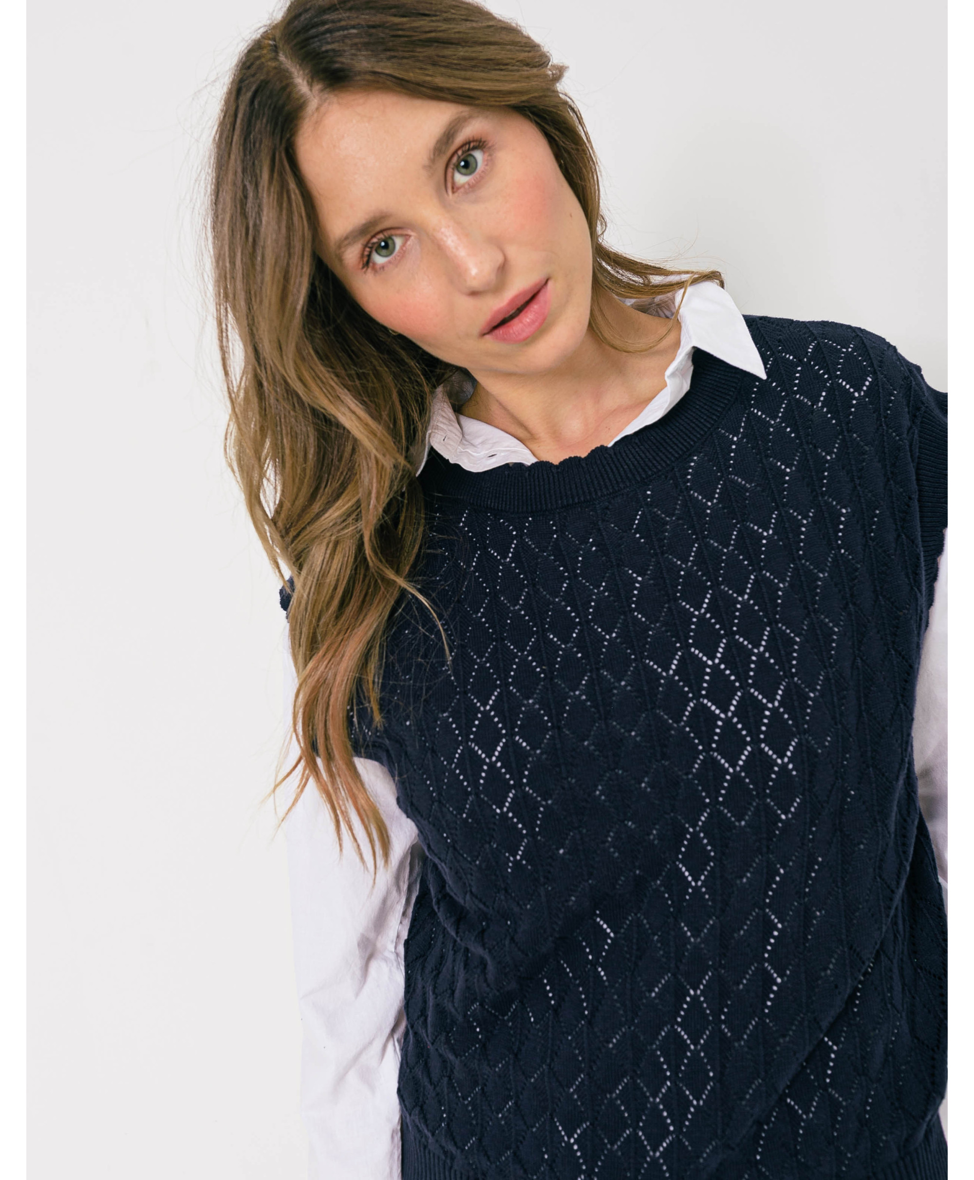 Offrez à votre tenue un côté de rétro avec sa coupe sans manches, féminisée par sa maille ajourée. A mixer à une chemise manche longue blanche, un jean et des sneakers pour un look branché.
