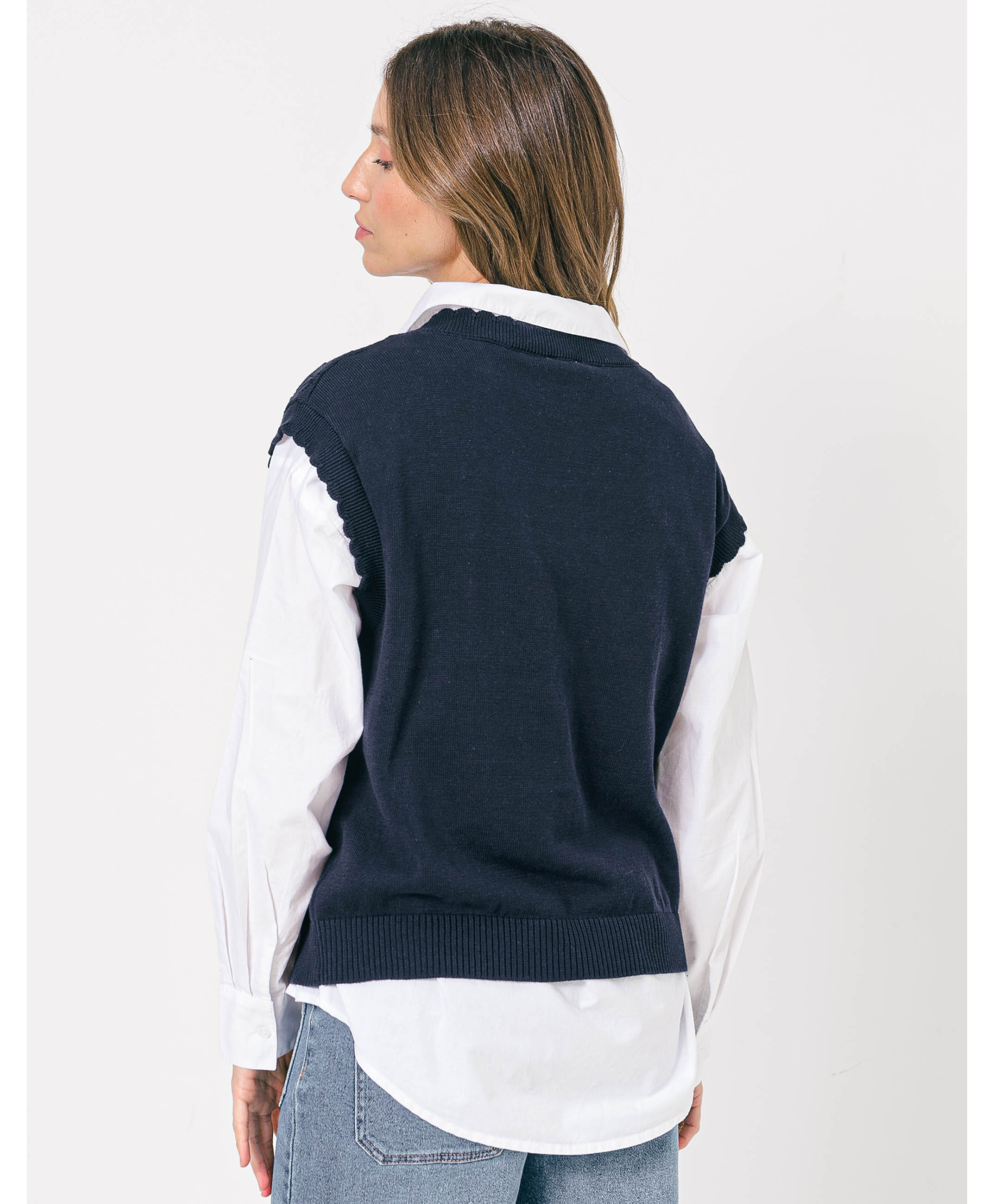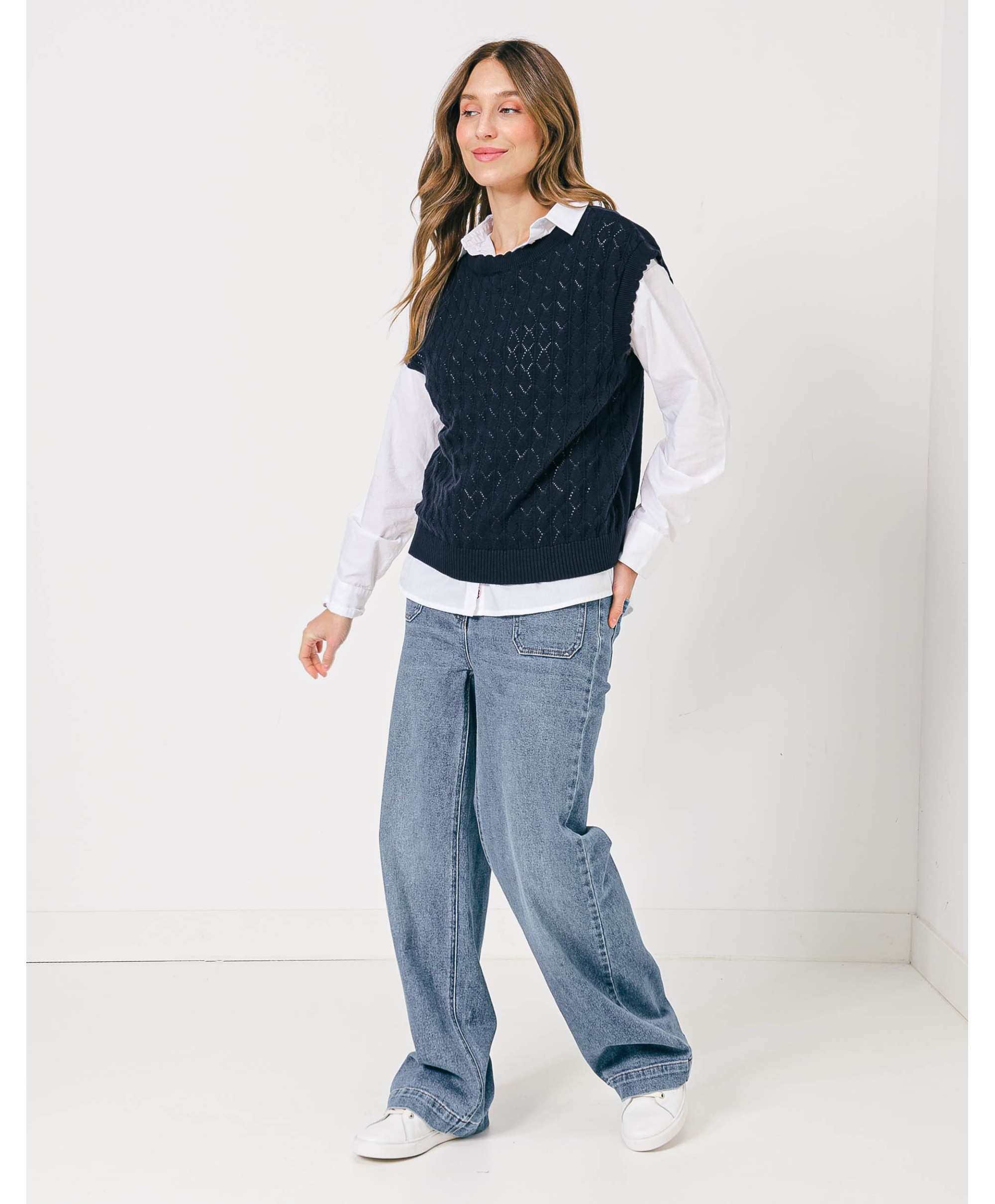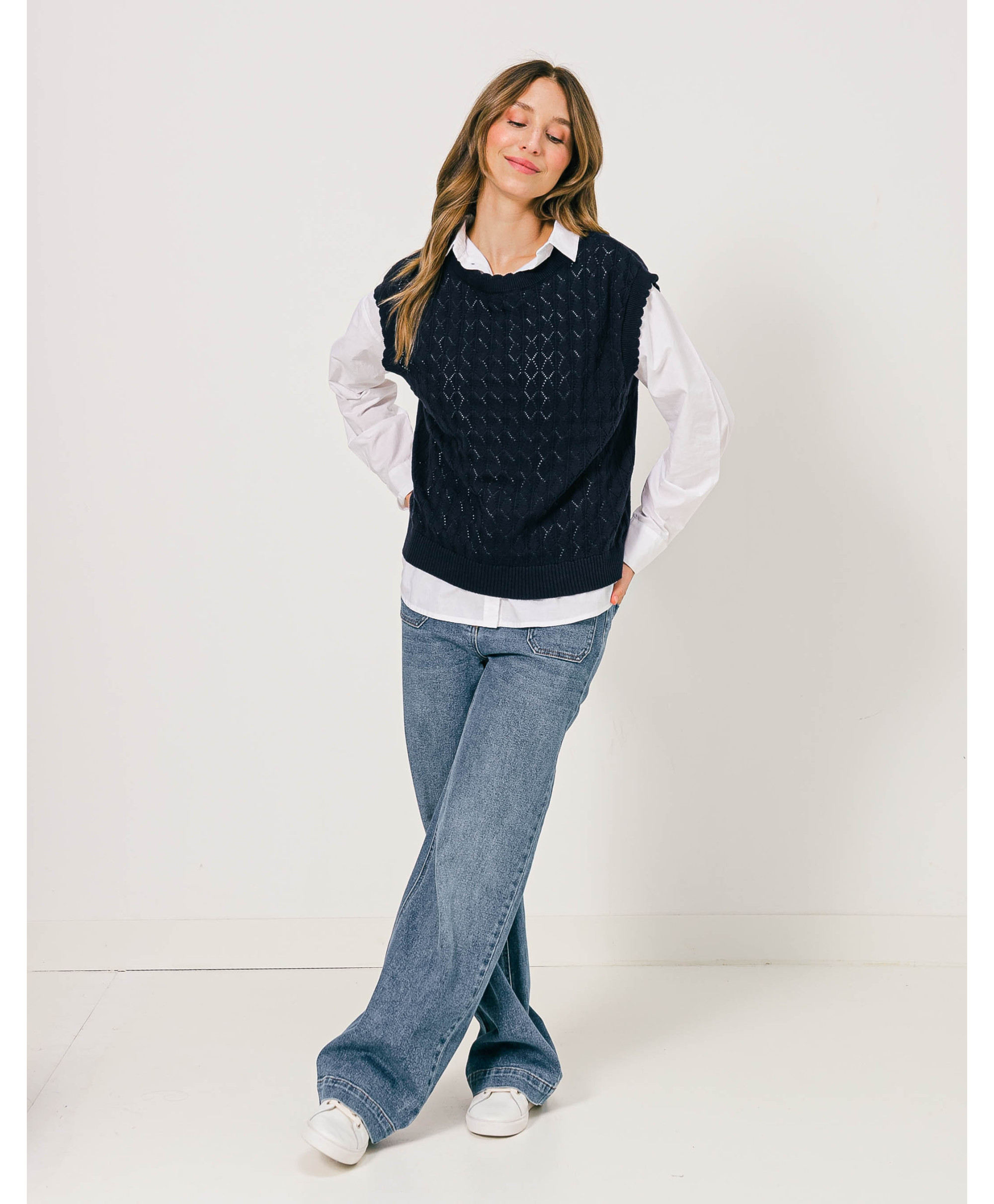 Offrez à votre tenue un côté de rétro avec sa coupe sans manches, féminisée par sa maille ajourée. A mixer à une chemise manche longue blanche, un jean et des sneakers pour un look branché.