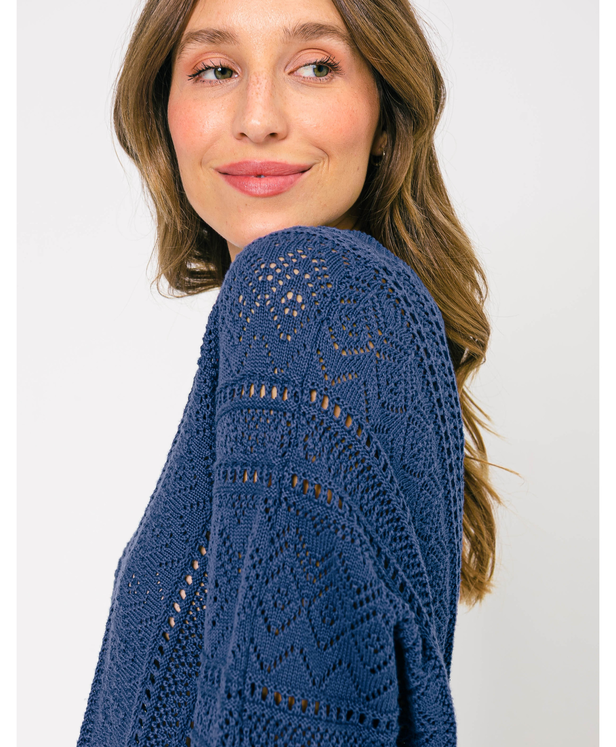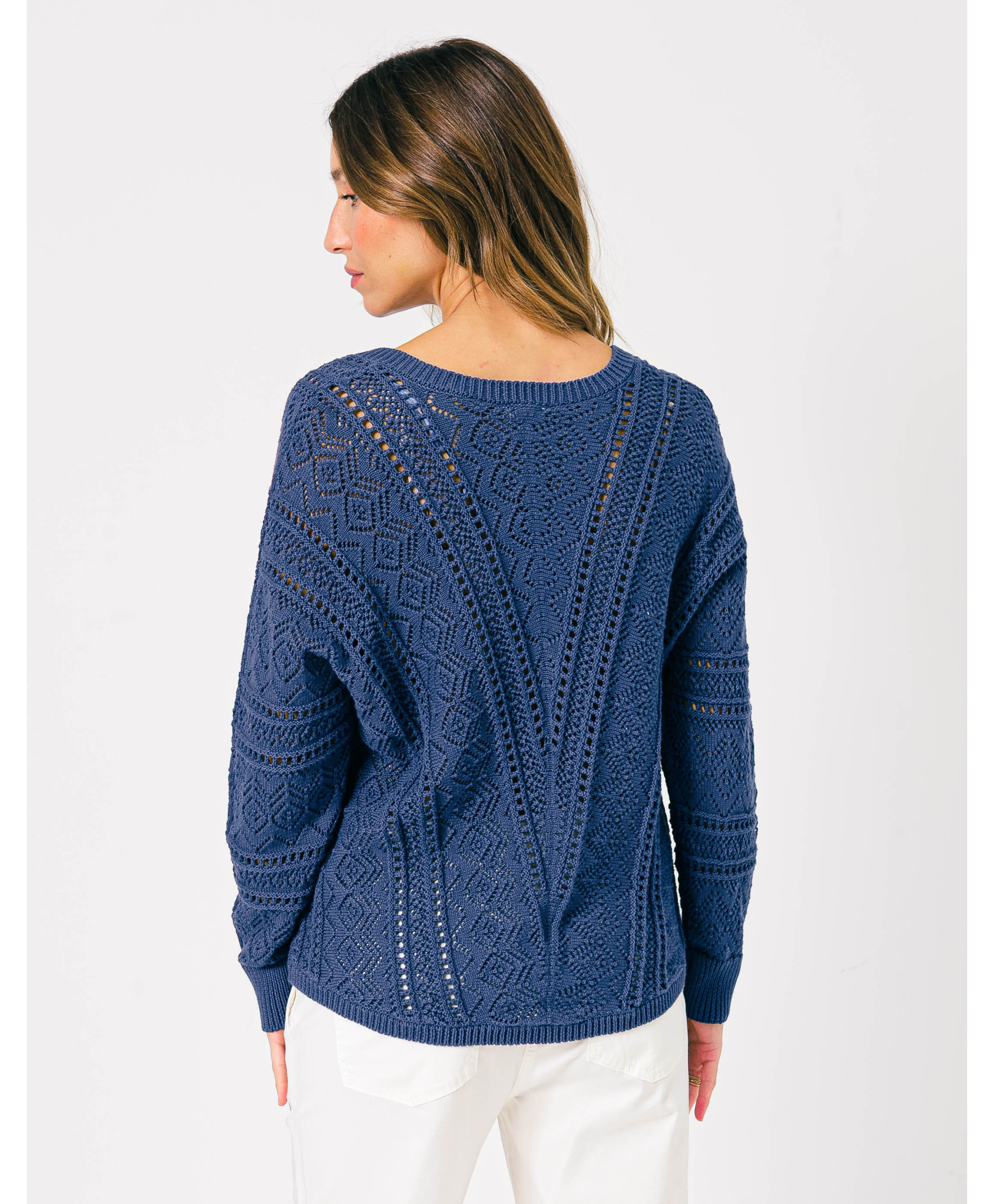 Ce pull col rond s’habille de maille ajourée façon crochet. Il apporte instantanément une touche féminine à un look, associé à un jean ou une jupe. Facile à vivre, un basique incontournable du dressing.