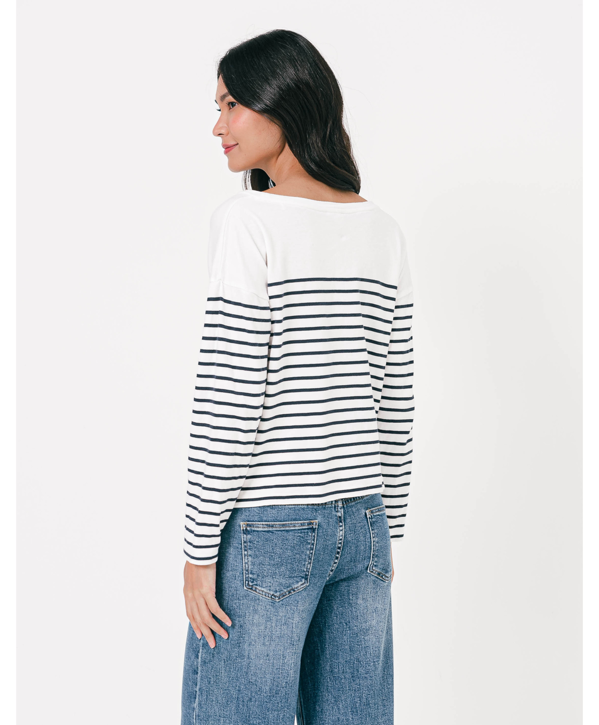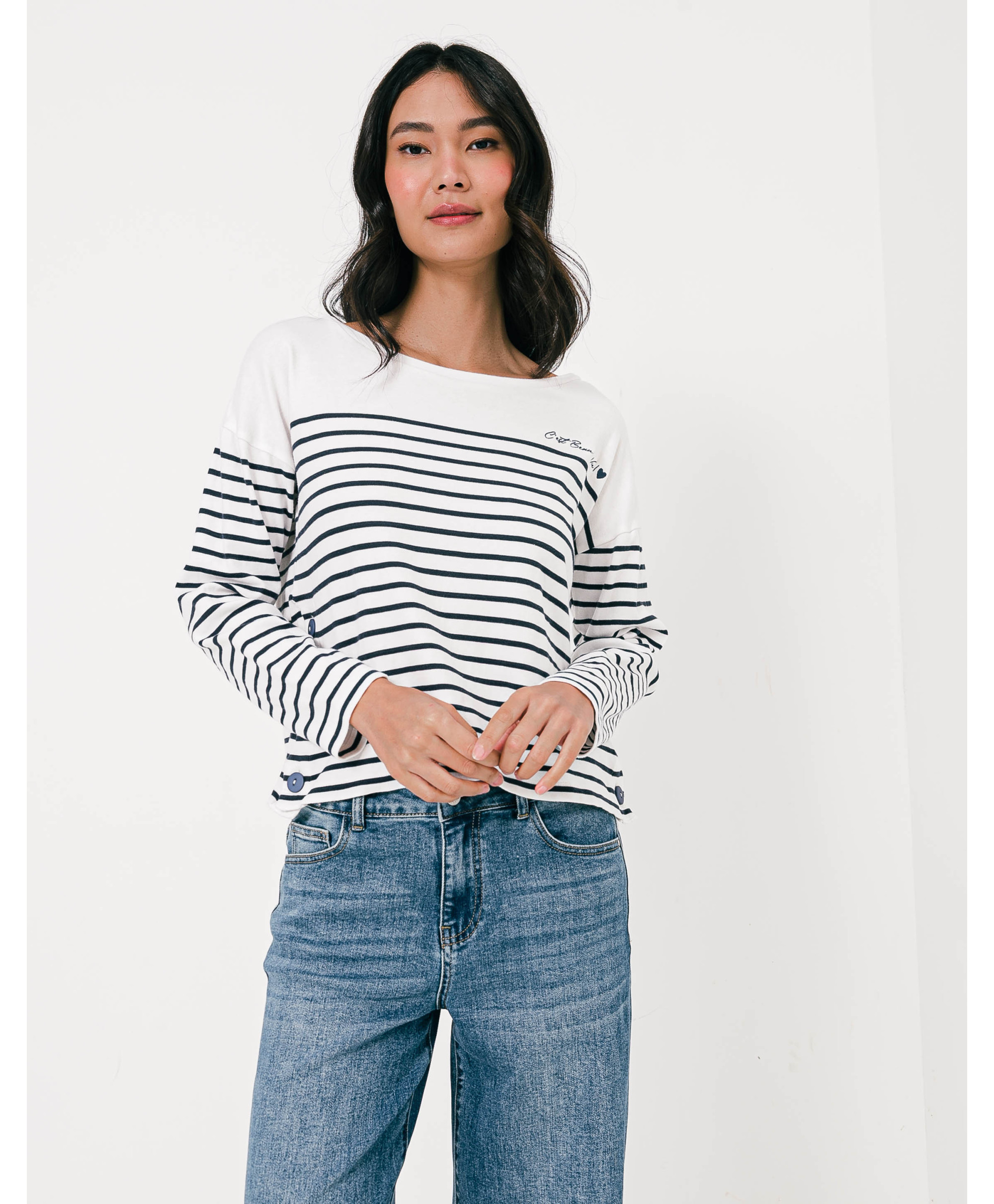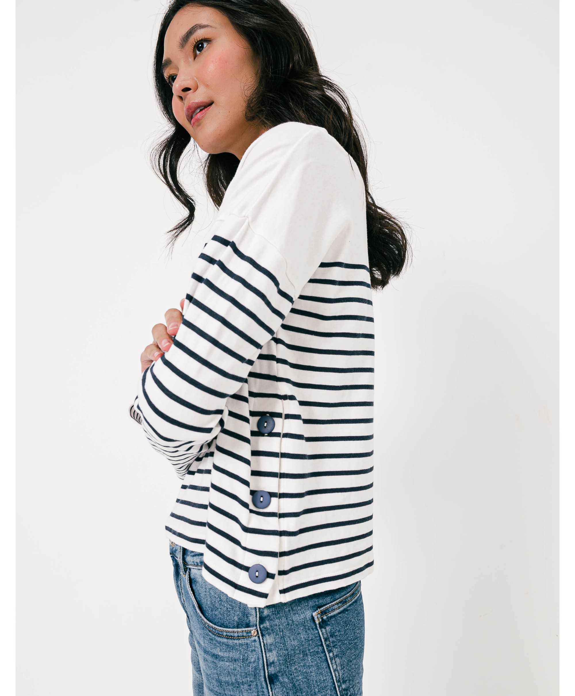 Le sweat à rayures signature en coton a l’audace de mélanger l’allure décontractée du molleton, l’élégance de la rayure et des boutons sur l'épaule. Un mélange des styles moderne et confortable facile à porter au quotidien. Un bel intemporel dessiné par nos stylistes.