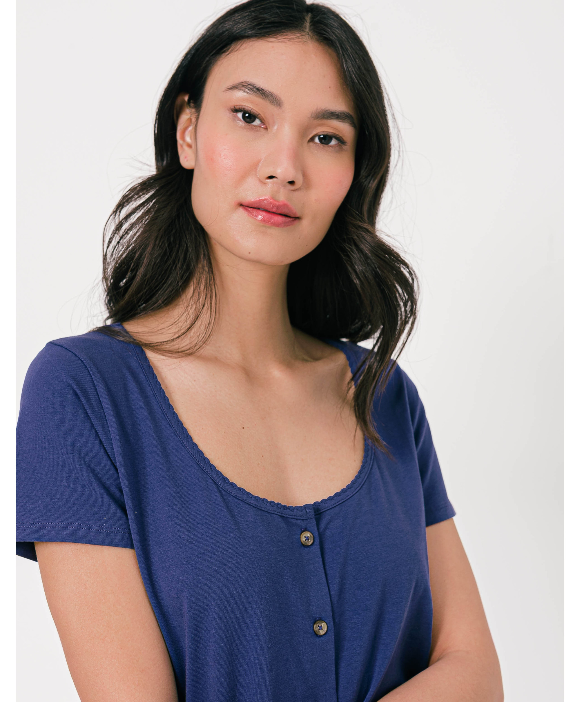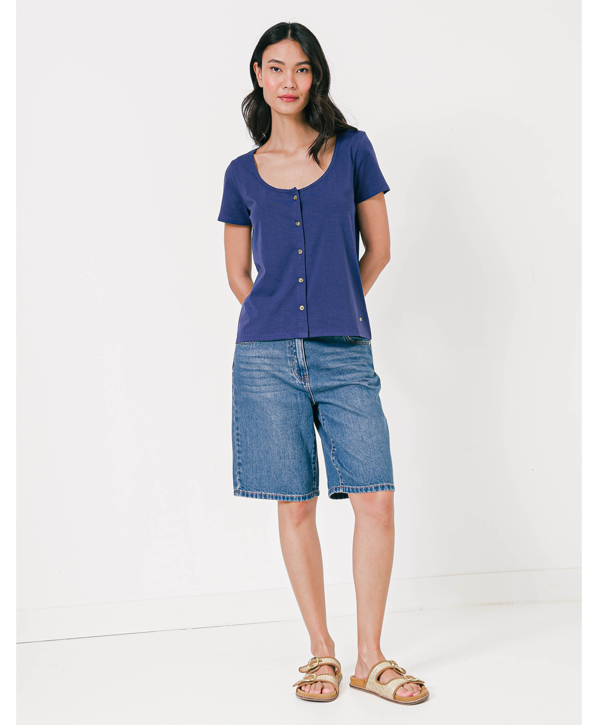 Un tee-shirt à manches courtes au look élégant et raffiné, agrémenté d’une rangée de boutons décoratifs. A porter avec une jupe et des escarpins, avec un pantalon en toile et des derbies ou encore avec un jean et des baskets.