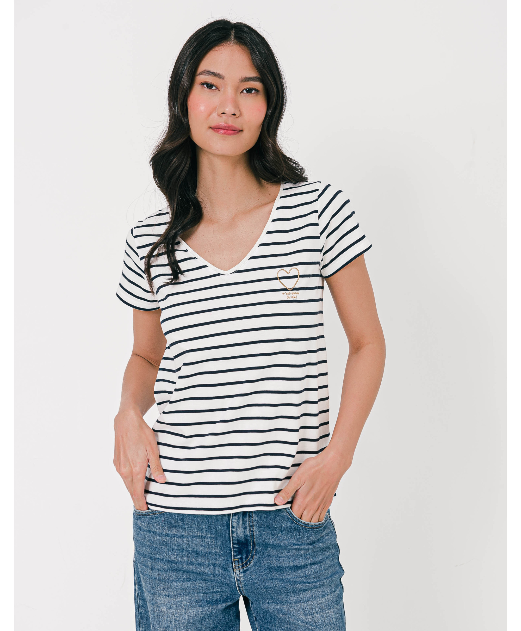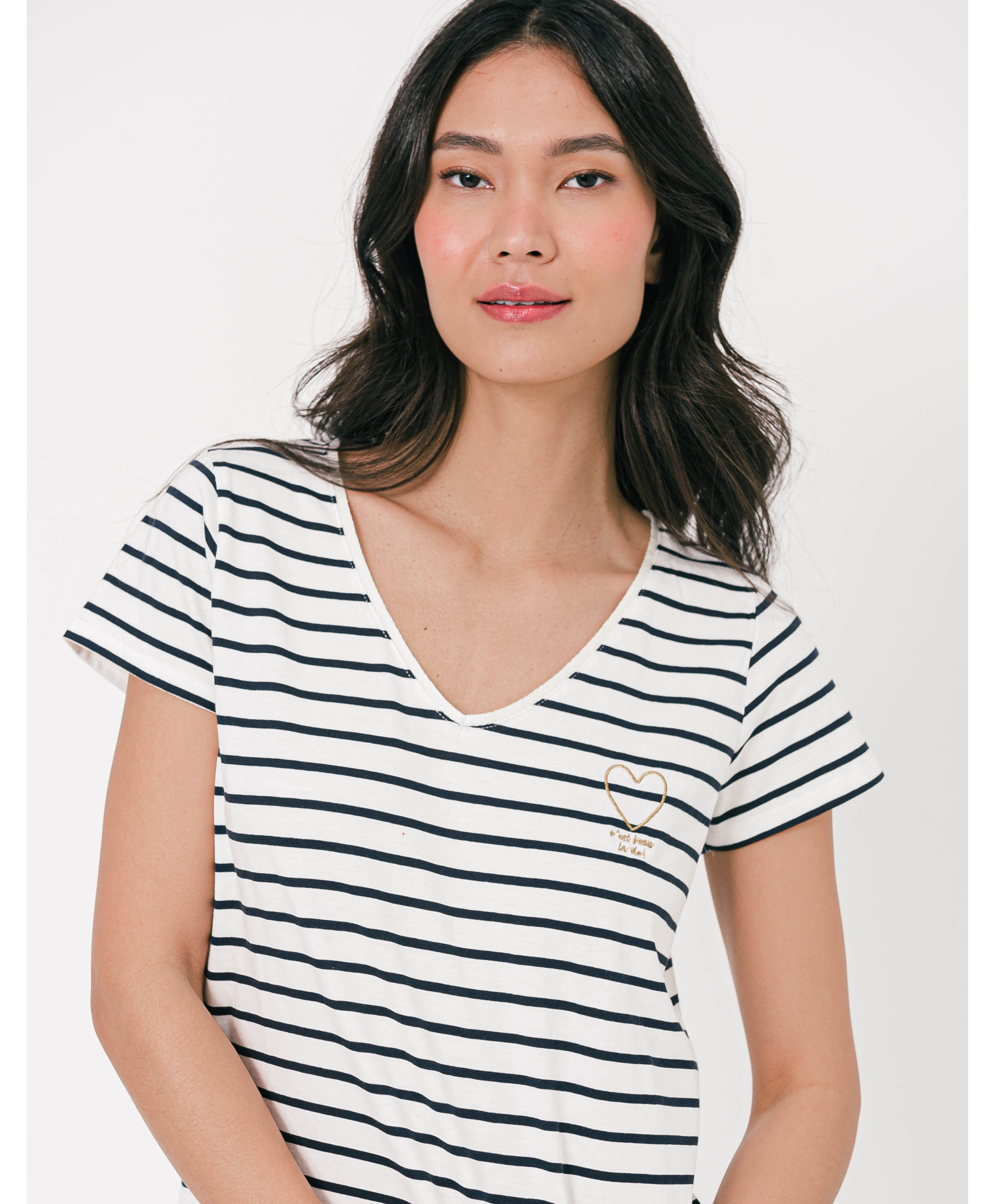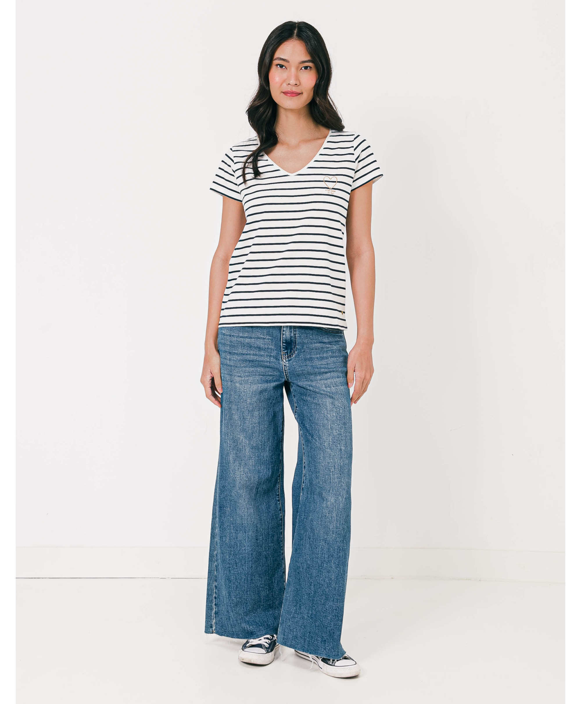 Indispensable pour la saison estivale, le tee-shirt à rayures pour femme se démarque cette année par sa broderie sur la poitrine et son décolleté V à l'avant. Un tee-shirt marin à porter avec un short en jean, mais aussi avec un pantalon fluide.