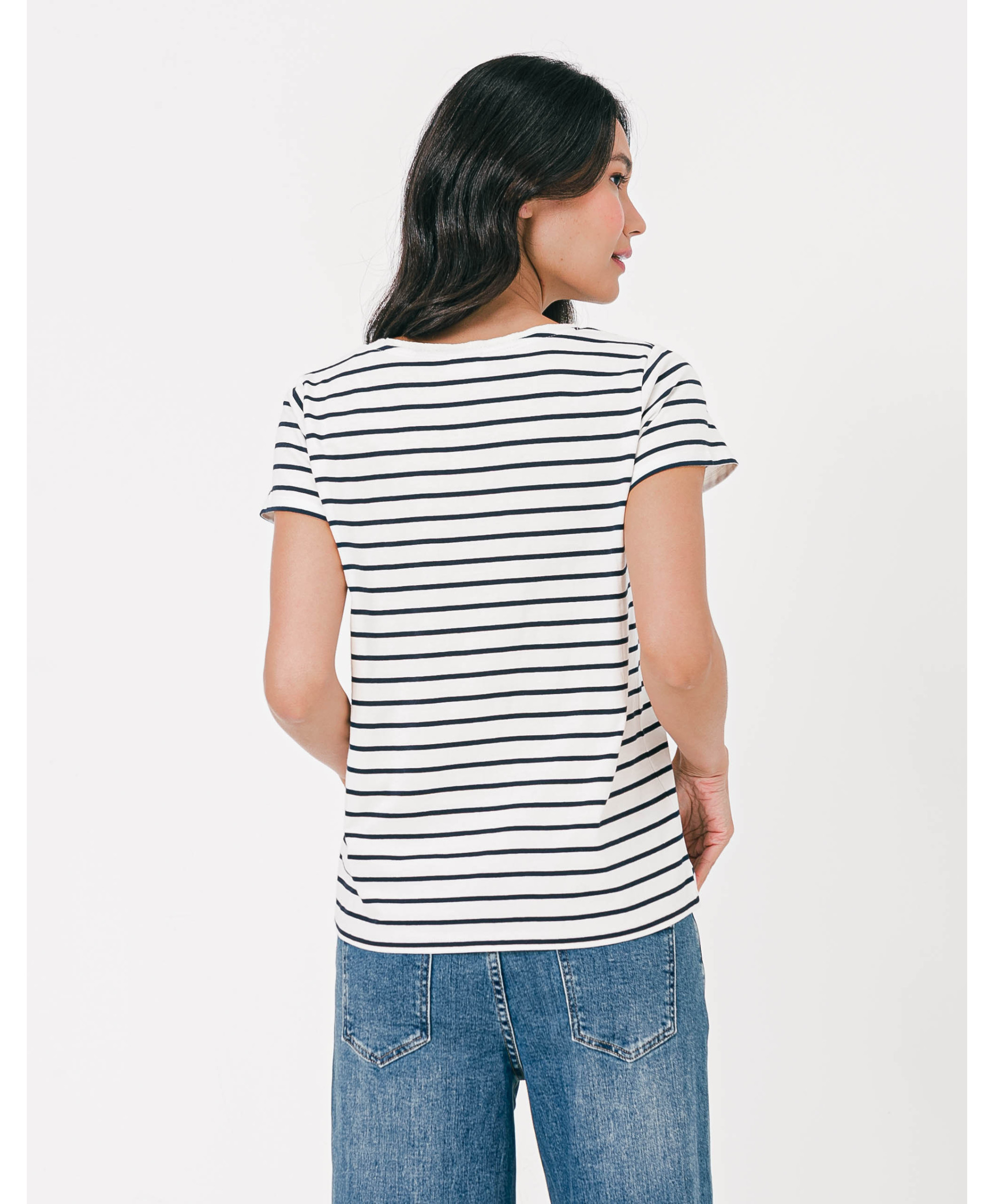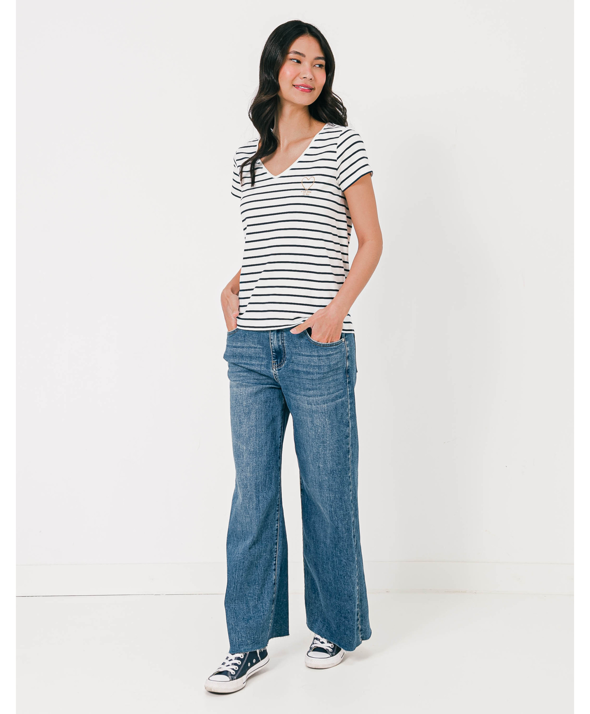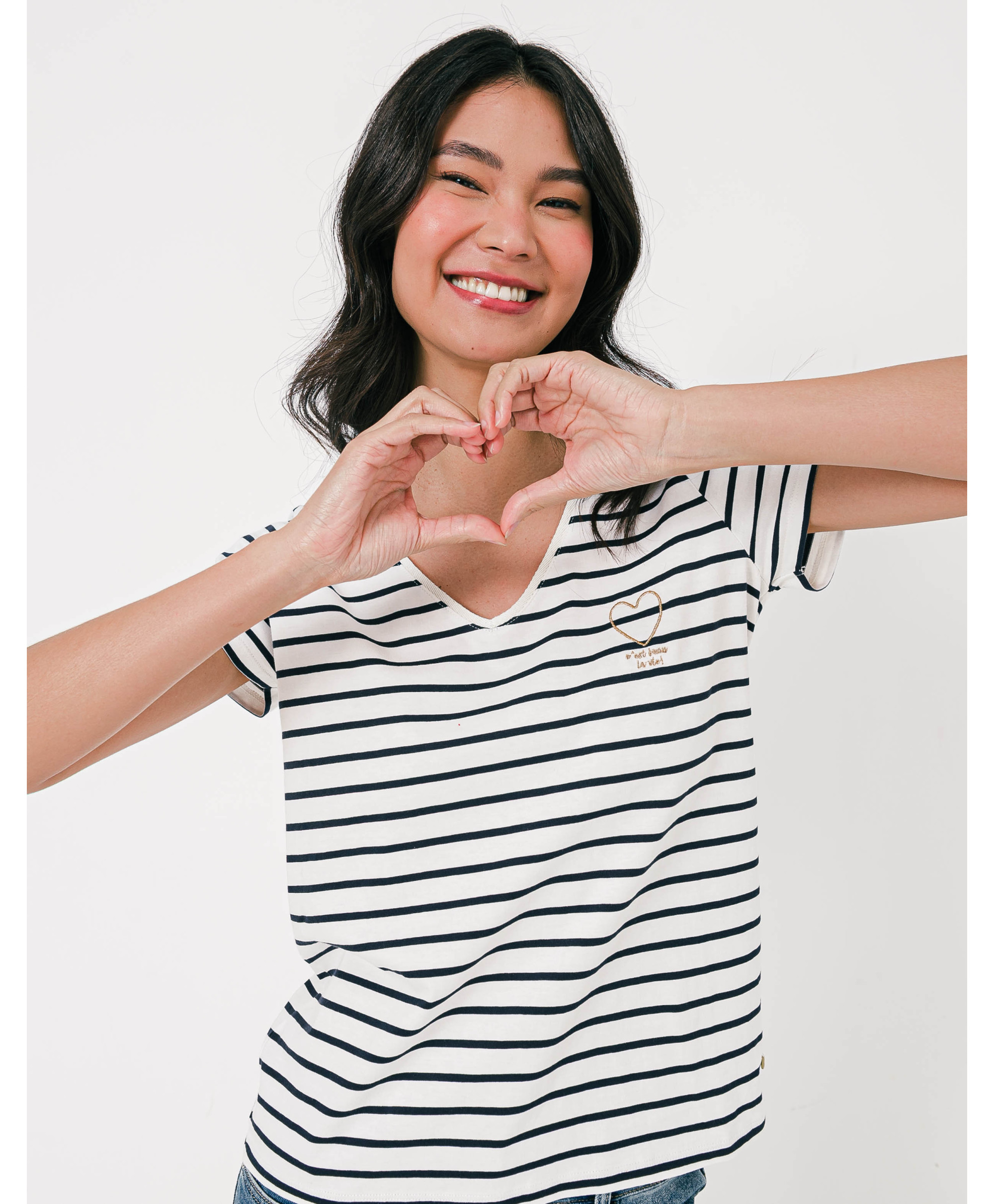 Indispensable pour la saison estivale, le tee-shirt à rayures pour femme se démarque cette année par sa broderie sur la poitrine et son décolleté V à l'avant. Un tee-shirt marin à porter avec un short en jean, mais aussi avec un pantalon fluide.