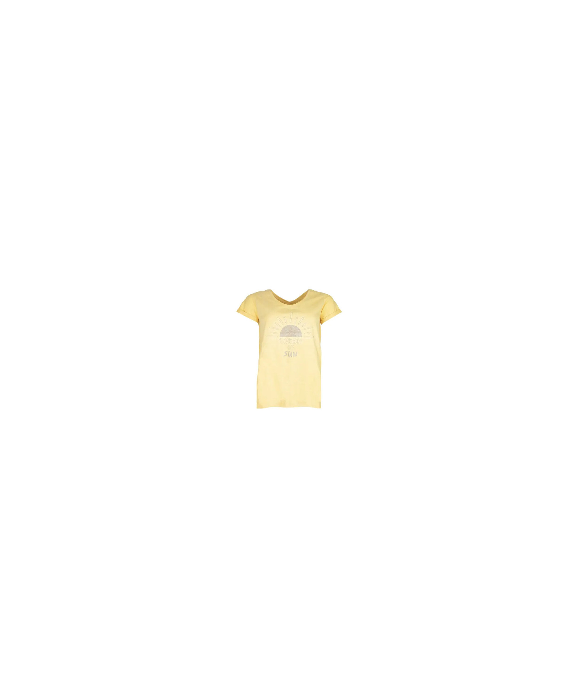 Ode à la saison estivale avec ce tee-shirt femme ! Un tee-shirt manches courtes en coton, décoré sur l'avant d'un motif SOLEIL et d'un message "Sun", sur fond de couleur ensoleillé. Idéal pour twister une jupe ou un short fluide. Le tee-shirt en coton présente une coupe droite confortable et un col V. Dos uni.